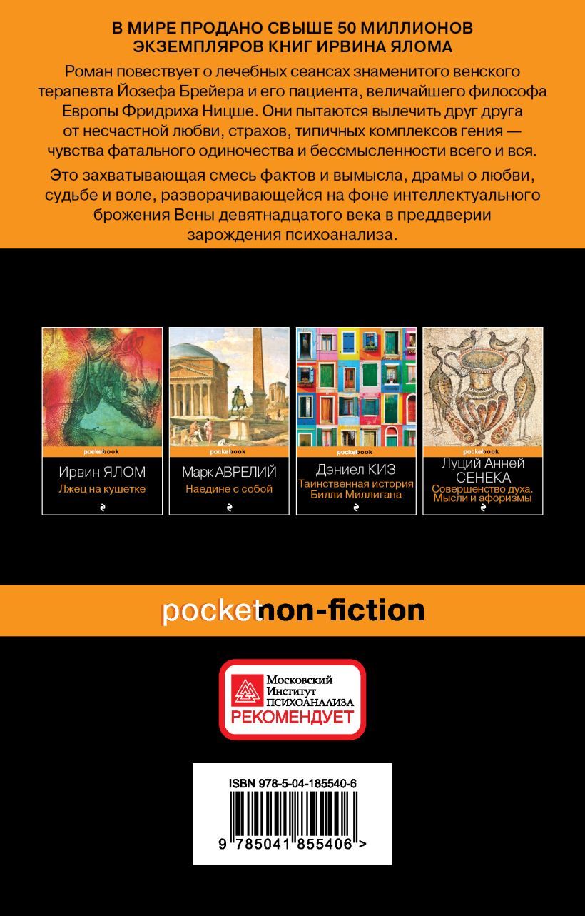 An extraordinary patient... A talented doctor tormented by torment... A secret pact. These elements combine to create an unforgettable saga of the alleged relationship between Europe's greatest philosopher (F. Nietzsche) and one of the founding fathers of psychoanalysis (J. Breuer).