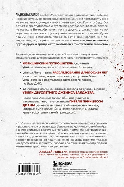 What marks would you look for on a truck in which stolen goods were being transported? After reading this book, you will know the answer to that question. Its author, Angela Gallop, the UK's most sought-after forensic scientist and unsolved cases specialist, explains how crime solving is done. Angela argues that every crime scene has evidence, the hardest part is finding it and collecting it carefully: blood, DNA, glass shards, pollen and more. As you read, it becomes clear how complex forensic science is: to reconstruct the course of a crime and uncover the truth about what really happened, experts need not only to be extremely attentive to detail, but also to be able to think outside the box.
