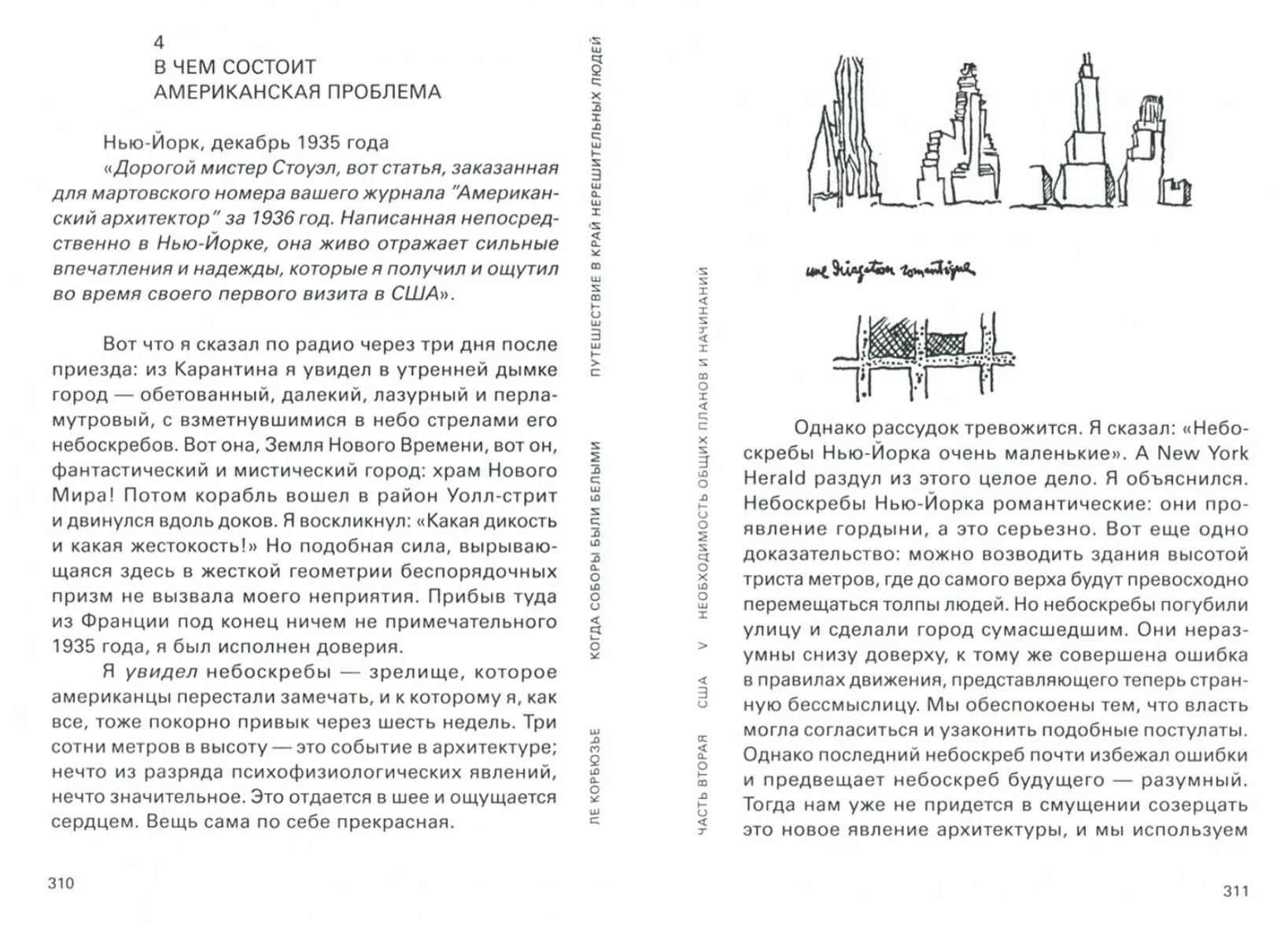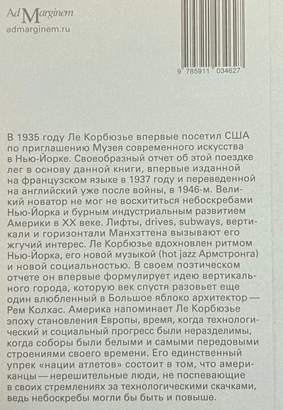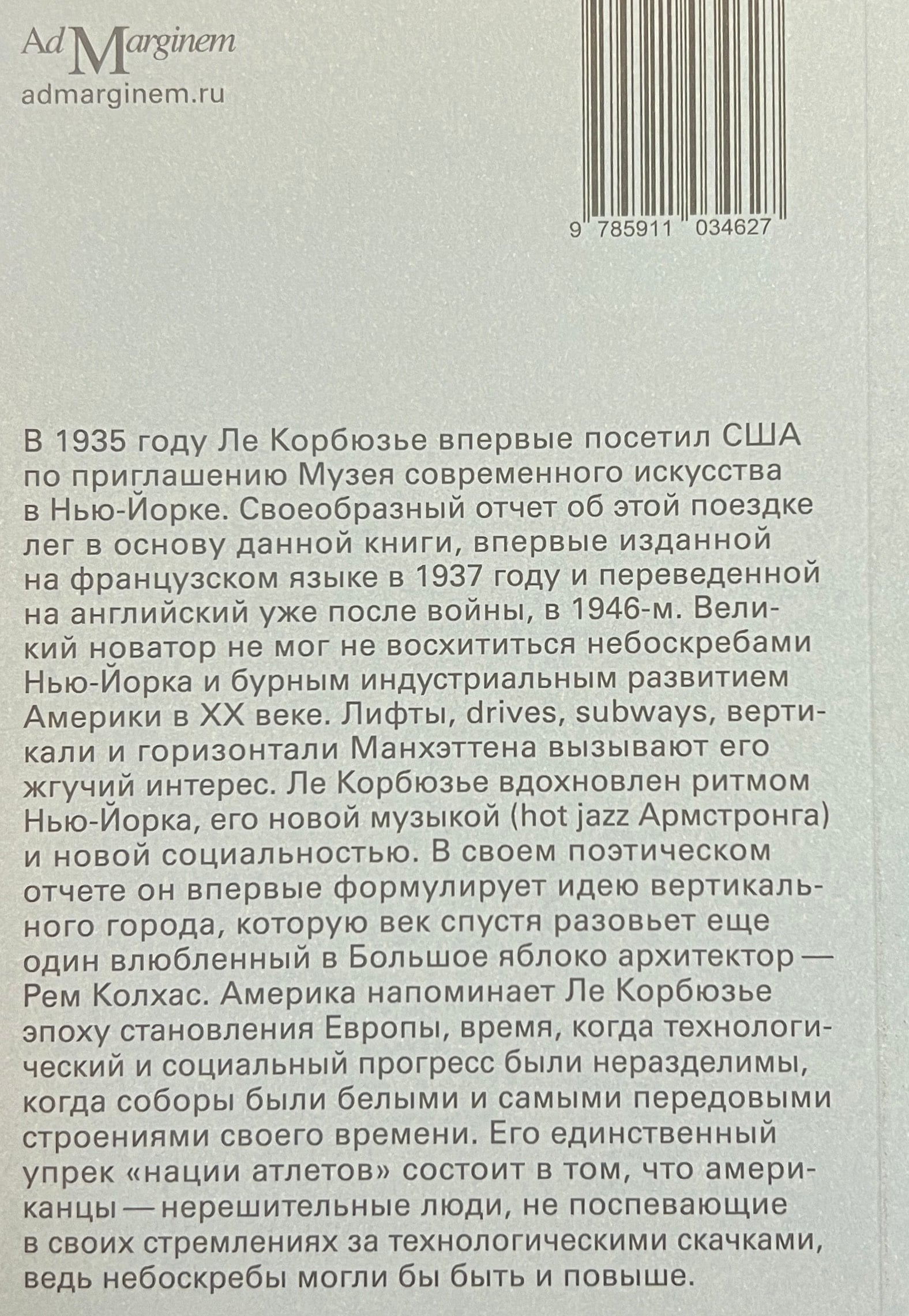In 1935, Le Corbusier visited the United States for the first time at the invitation of the Museum of Modern Art in New York. A kind of report on this trip formed the basis of this book, first published in French in 1937 and translated into English after the war, in 1946. The great innovator could not but admire the skyscrapers of New York and the rapid industrial development of America in the XX century. Elevators, elevators, subways, verticals and horizontals of Manhattan cause his burning interest. Le Corbusier is inspired by the rhythm of New York, its new music (Armstrong's hot jazz) and new sociality. In his poetic account, he first articulates the idea of the vertical city, which a century later would be developed by another architect in love with the Big Apple, Rem Koolhaas. America reminds Le Corbusier of the formative era of Europe, a time when technological and social progress were inseparable, when cathedrals were white and the most advanced buildings of their time. His only reproach to the "nation of athletes" is that Americans are indecisive people who cannot keep up with the technological leaps in their aspirations, because the skyscrapers could have been taller.