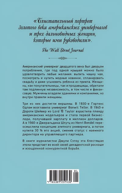 The famous American journalist reconstructs the life and career path of women who ran major New York department stores in the 1920s–1960s and turned them into a paradise for shoppers of all ages and social classes. Thanks to these women, the American fashion industry acquired its own face and stopped blindly copying European, especially Parisian, fashion. Each of the book's heroines is a strong and bright personality whose example helped millions of women believe in themselves and trade housework for a professional career.