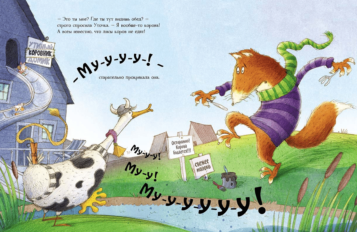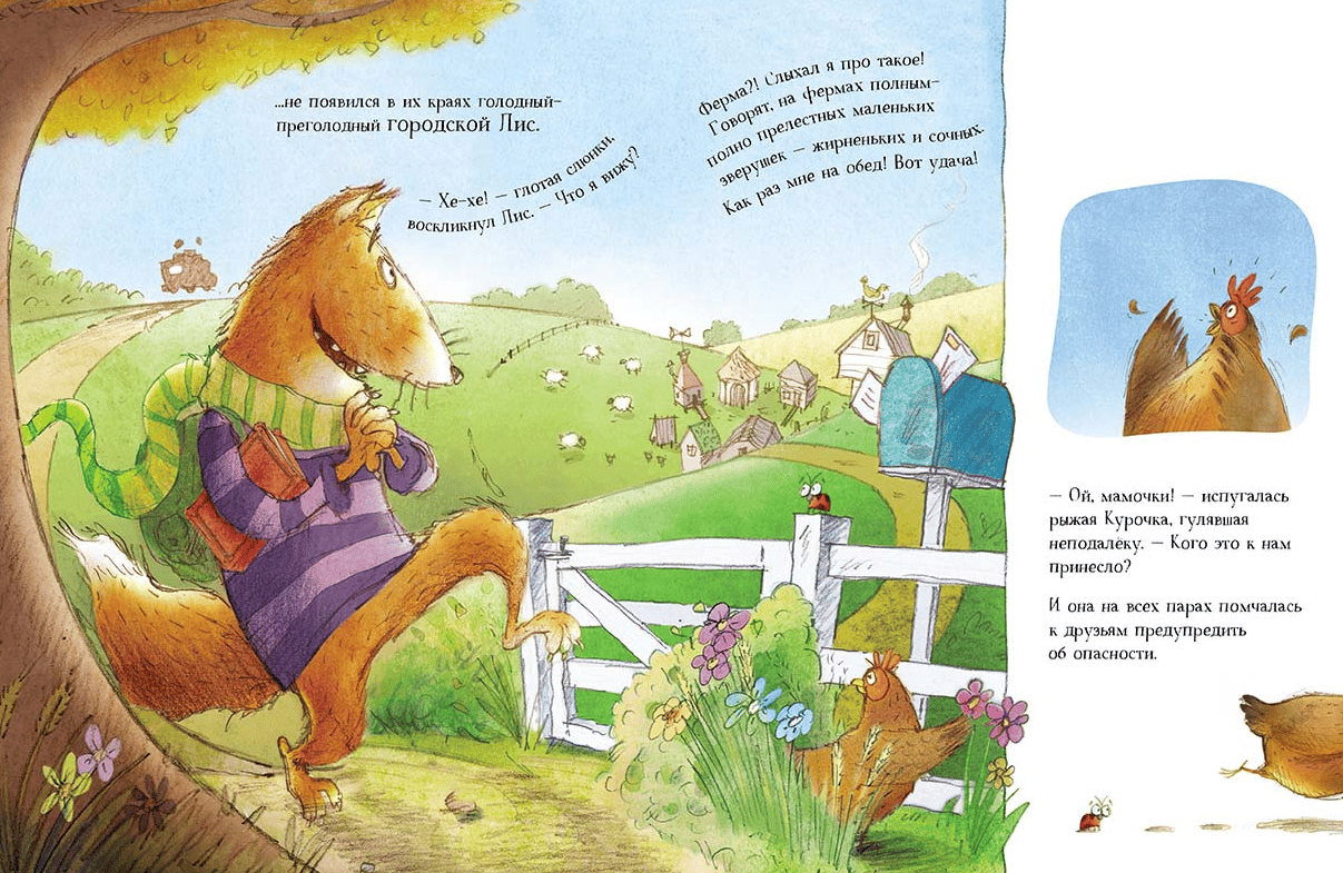 Far, far away on the farm, among the endless fields, there lived a red chicken, a white duck, a curly sheep and a big bull. They lived amicably and cheerfully and did not know their worries until one day a hungry and hungry city fox appeared in their lands. This fox has never been to the village before. He had never seen chickens, sheep or ducks, and had no idea what they looked like. But I heard about how tasty they were and intended to have a proper lunch of well-fed farm animals. Farm dwellers panicked: Will Fox eat them now? They are not going to give up so easily and under the guidance of the Bull develop a bold plan to outsmart the ignorant predator.