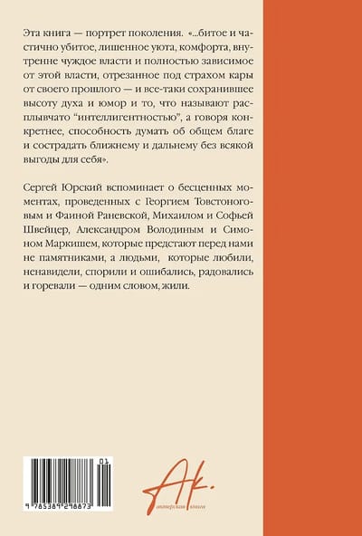 Sergey Yursky recalls priceless moments spent with Georgy Tovstonogov and Faina Ranevskaya, Mikhail and Sofya Shveitser, Alexander Volodin and Simon Markish, who appear before us not as monuments, but as people who loved, hated, argued and made mistakes, rejoiced and grieved – in a word, who lived.