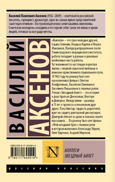 "Colleagues" are three young friends, Sashka Zelenin, Vladka Karpov and Leshka Maksimov. After being assigned to different and rather unusual places of work after graduating from the Leningrad Medical Institute, the guys end up in different and rather unusual places of work. This is where real adult life begins: with their first serious love and the search for the only right path. In 1962, a film of the same name was made based on the novel, starring Oleg Anofriev, Vasily Lanovoy and Vasily Livanov.