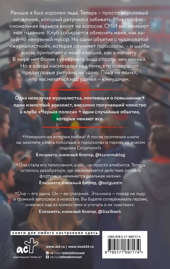I used to be the king of the ice. Now I'm just a grumpy loser who's forgotten how to score. My professional career is hanging by a thread. The media is mocking my fall. The club is going to trade me like some kind of useless trash. But one hug with an eccentric "journalist" who makes up horoscopes - and the puck is once again stuck to my stick like a magnet. There is no more superstitious sport in the world than hockey. But I've always mocked those who perform pre-game rituals for good luck. Until I realized that mocking good luck leads to bad luck.