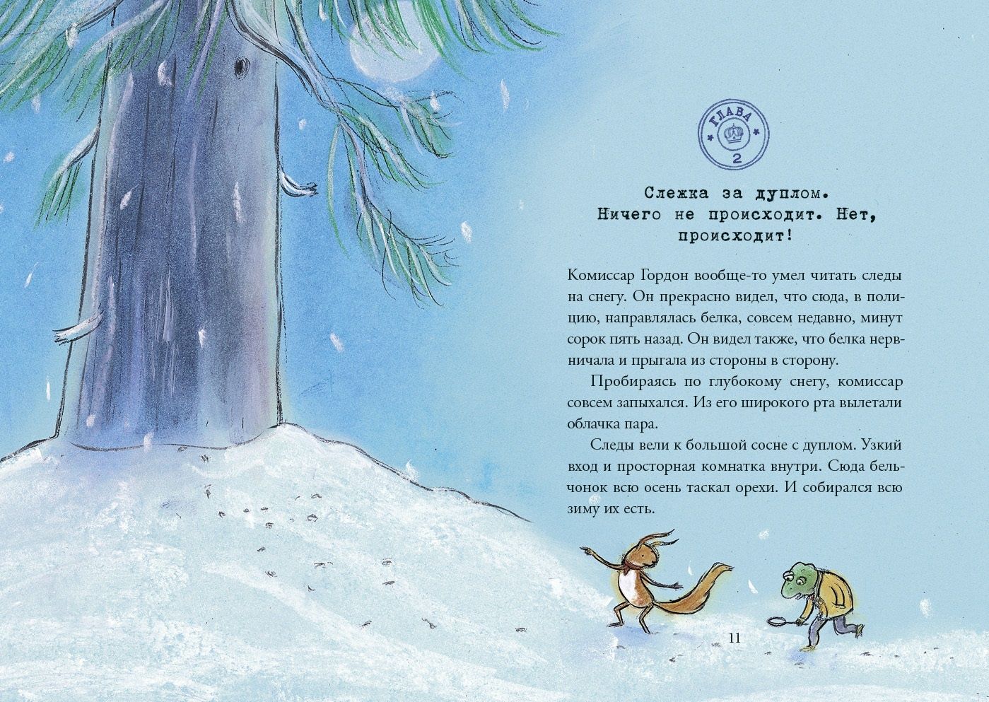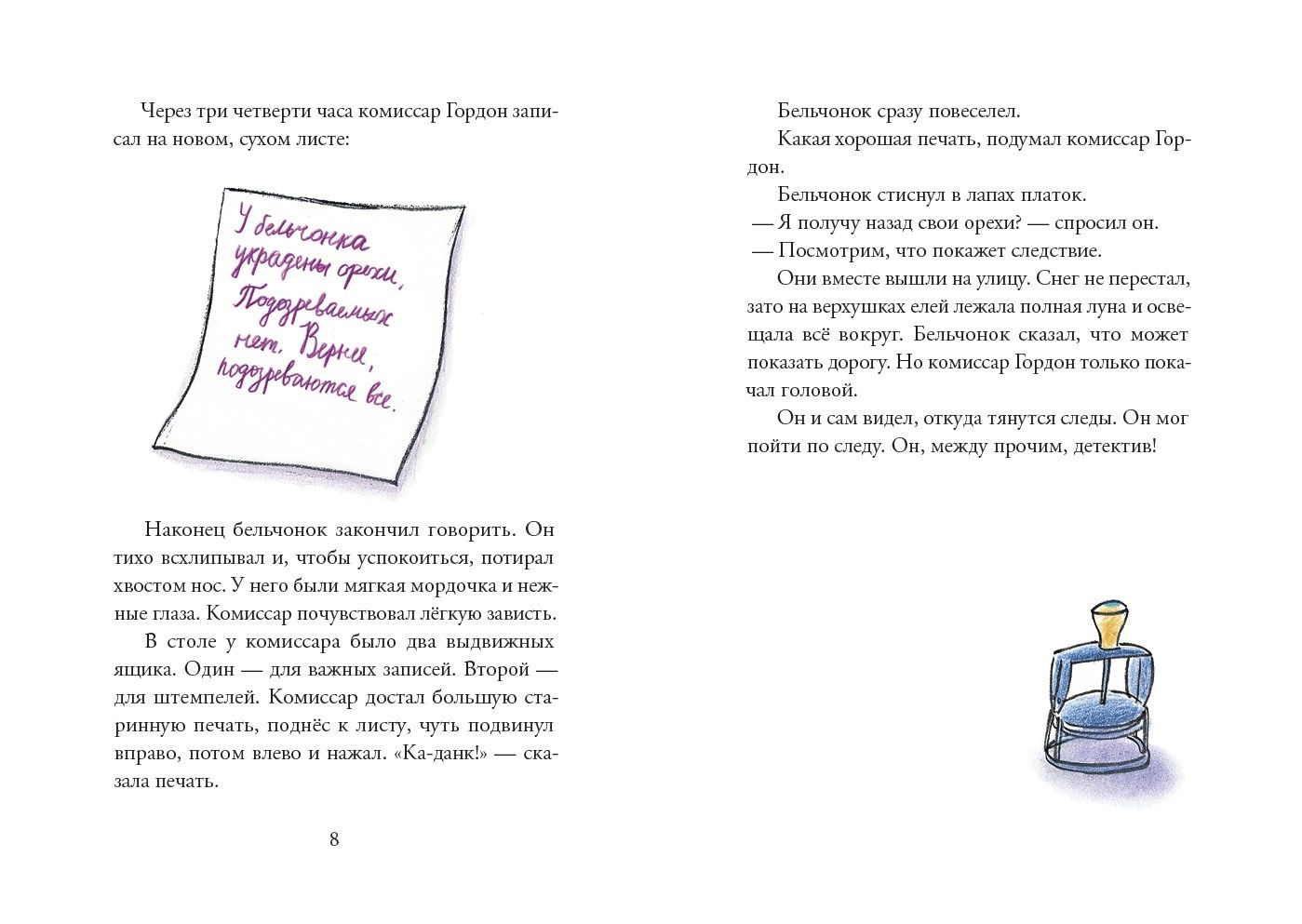 In the forest, someone is stealing nuts from the animals. Finding the thief is a matter of honor for Commissioner Gordon, an experienced detective. Even if it means sitting in ambush all winter night. But when the burglar finally appears, the commissioner can't move: he's frozen! What an embarrassment. He has to ask for help from the criminal himself. But the unfortunate incident unexpectedly turns into luck ... A series of books about Commissioner Gordon - is a detective in which the adult reader will undoubtedly recognize the parody of the classic examples of the genre. And the young detective lover (ages 6 and up) will be able to read these books aloud by role and to themselves. Inside the book is not only a fascinating story, but also a map with a plan of the area, which will come in handy for every budding detective!