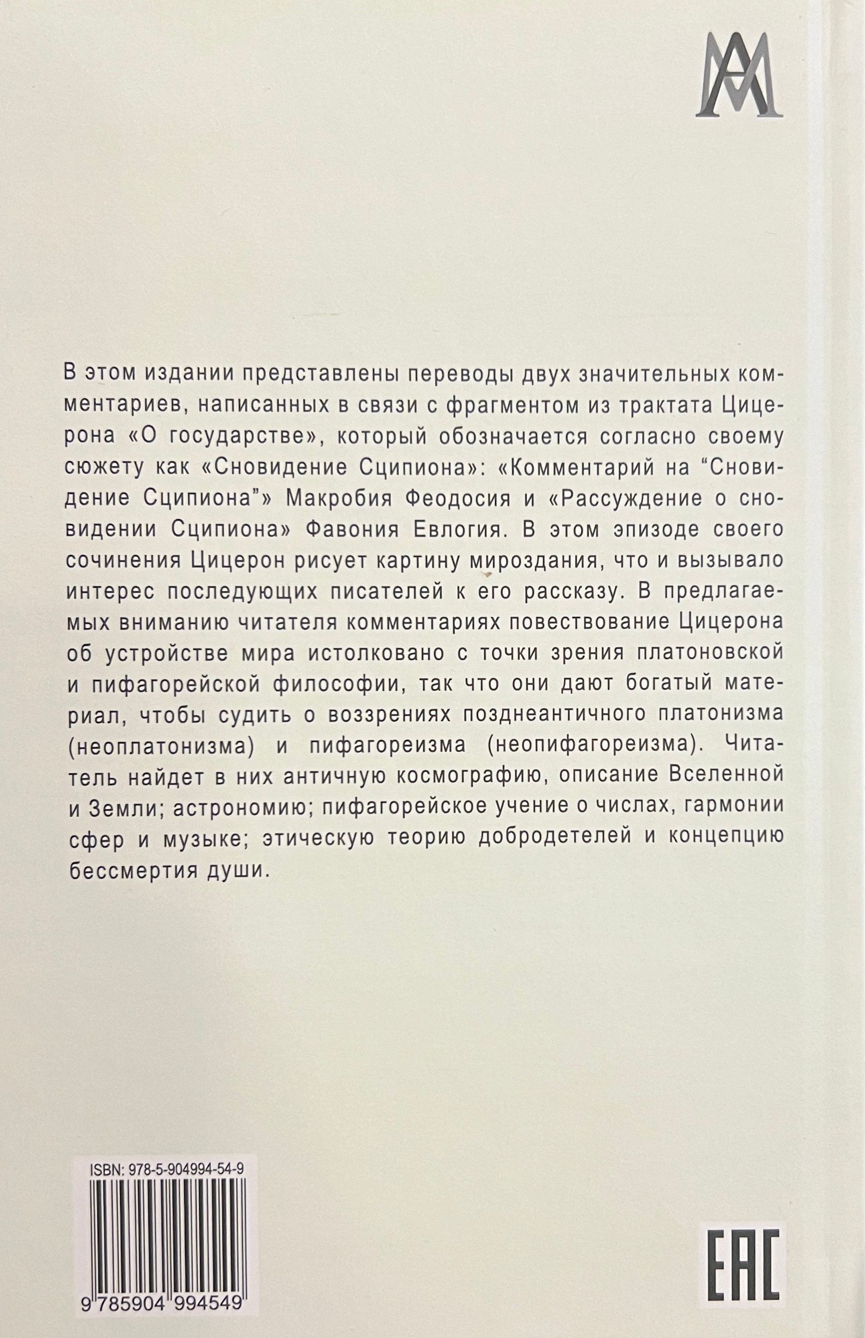 This edition presents translations of two significant commentaries written in connection with a fragment from Cicero's treatise On the State, which is designated according to its subject as "Scipio's Dream": "Commentary on Scipio's Dream" by Macrobius Theodosius and "Discourse on Scipio's Dream" by Favonius Eulogius Macrobius Theodosius and "Discourse on the Dream of Scipio" by Favonius Eulogius. In this episode of his work, Cicero draws a picture of the universe, which is what aroused the interest of later writers in his story. In the commentaries offered to the reader's attention, Cicero's account of the world order is interpreted from the point of view of Platonic and Pythagorean philosophy, so that they provide rich material to judge the views of late antique Platonism (Neoplatonism) and Pythagoreanism (Neopythagoreanism).