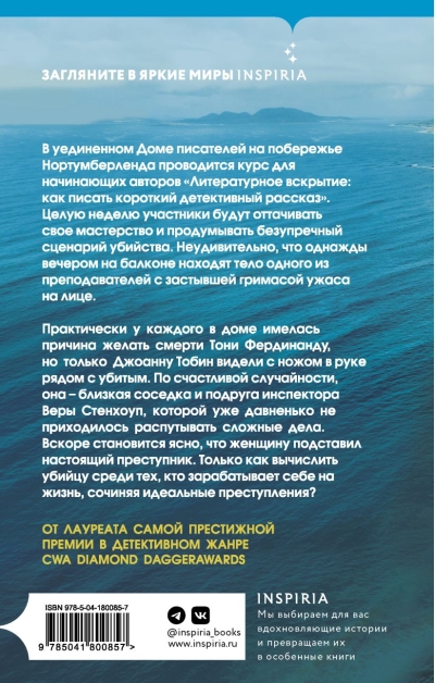 A course for aspiring authors, Literary Autopsy: How to Write a Short Detective Story, is being held at the secluded Writers' House on the Northumberland coast. For a whole week, participants hone their skills and devise a flawless murder scenario. Not surprisingly, one evening the body of one of the teachers is found on the balcony with a frozen grimace of horror on his face. Almost everyone in the house had reason to wish Tony Ferdinand dead, but only Joanna Tobin was seen with a knife in her hand next to the murdered man. As luck would have it, she is a close neighbor and friend of Inspector Vera Stanhope, who hasn't had to solve a complicated case in a long time. Soon it becomes clear that the woman was framed by a real criminal. But how can the killer be identified among those who make a living composing perfect crimes?
