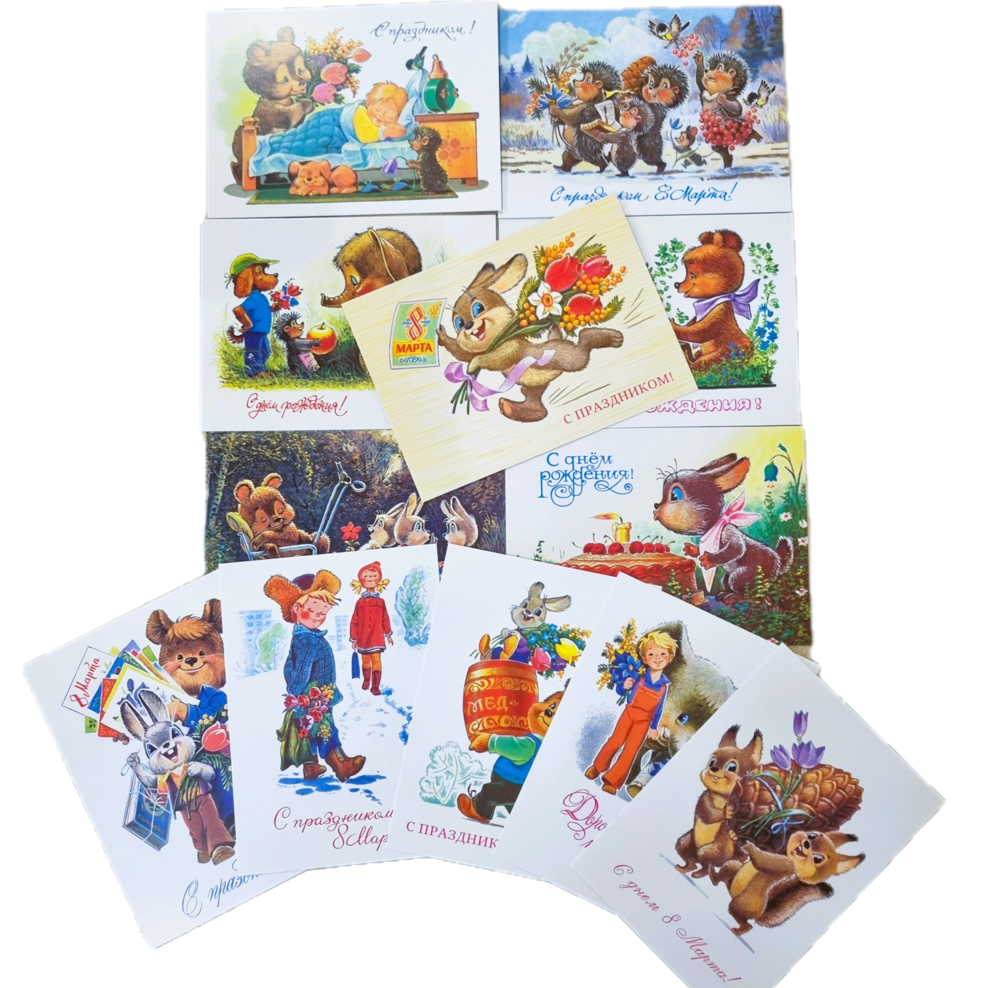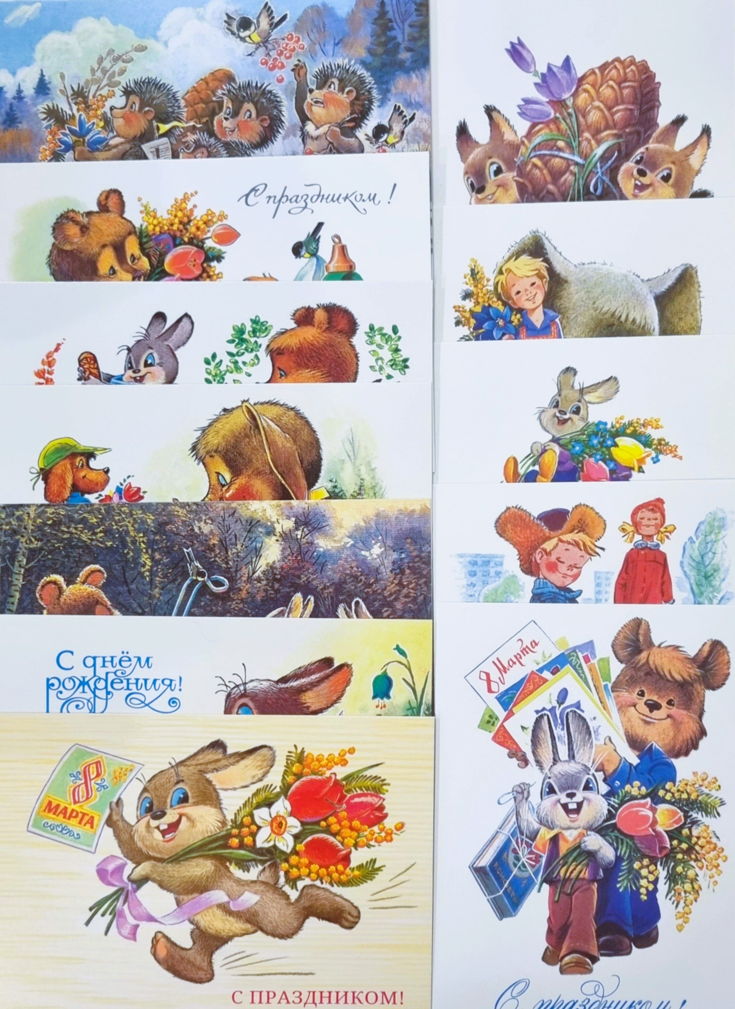 A set of retro greeting cards with drawings by Vladimir Zarubin. The set includes 12 cards with different plots. Rectangular cards. Card sizes: 14.5 cm x 10.5 cm Kind animals and children are so happy about spring that you want to join them immediately.