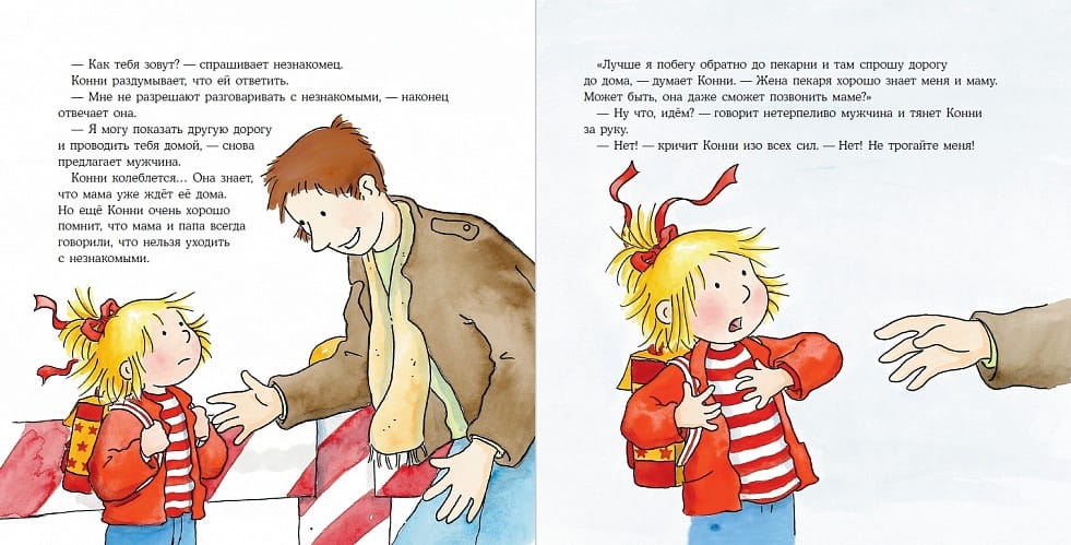 Connie has been walking home from school on her own for a long time. But suddenly the familiar road is blocked. What should she do? Is it worth accepting help from a stranger? A new story from Connie's life is a great reason to discuss with your child the rules of behavior with strangers without intimidation and to remind them that if you don't want something, you can say "no".