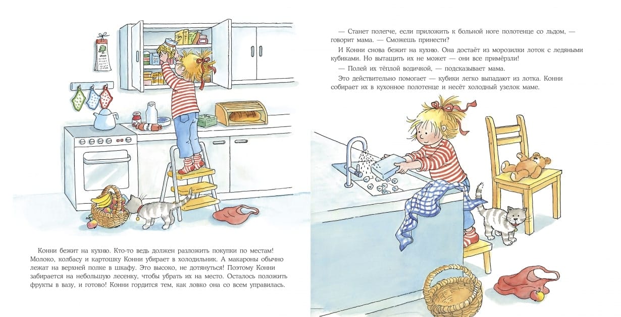 The series covers all the life skills a child encounters as they grow up, from ages 3 to 14. By identifying with the main character, children experience her story, learn, and explore the world. What the book is about: This book will teach children to act independently and care for their loved ones. When Connie's mother sprained her leg, the girl had a chance to prove that she was already big and independent! Here, Connie goes to kindergarten alone for the first time, cooks lunch, and cleans the house herself. Just like an adult. Together with the main character, children learn how to provide first aid, how to get to the doctor, and how to call a taxi. After this story, children will definitely be at ease if their loved ones need medical attention. A Guide for Parents, or What You Can Do with This Book: Develop Life Skills. This book will teach your child independence. They'll remember exactly what to do: check if the door is locked before leaving; never talk to strangers on the way to kindergarten; find another solution when something doesn't go according to plan, rather than throwing a tantrum; take initiative and help make dinner or clean up their room.