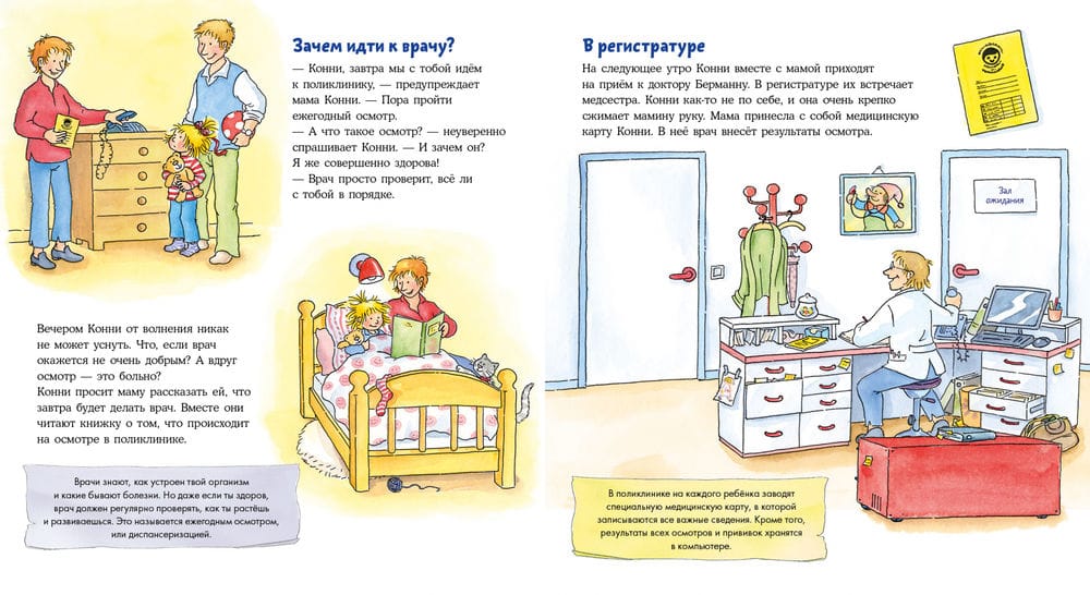 If you prepare your baby in advance for a trip to the clinic, a visit to the doctor can go quite smoothly. Connie, for example, is not afraid to go to the doctor. Mommy explained to her why she needs to be examined, and now Connie knows that it is not scary at all! Together with Connie the baby will stop being afraid of doctors and get acquainted with different medical devices. And also in the book with windows you can open the door to any office and even see what is in the doctor's drawers!