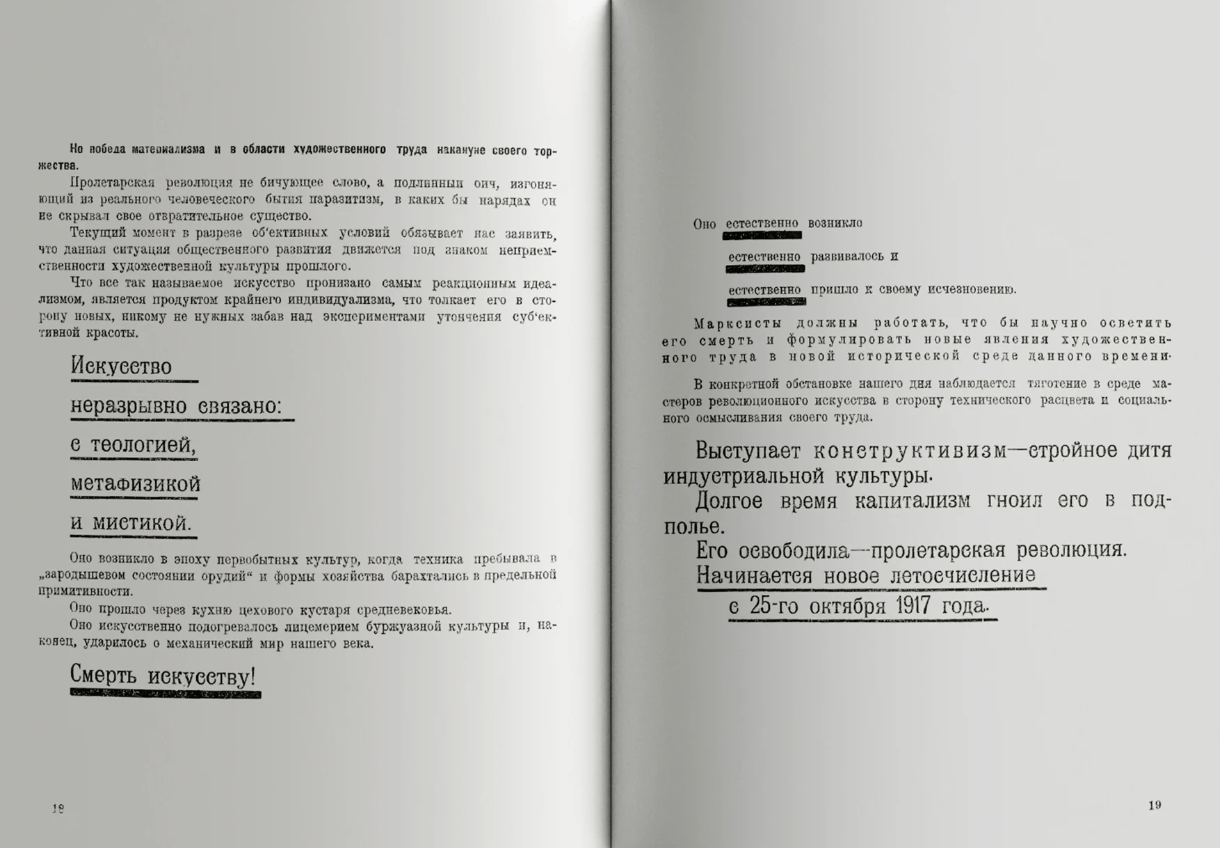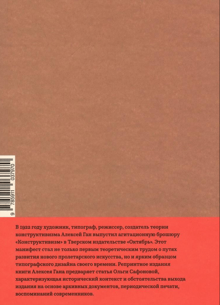 In 1922, the artist, typographer, director, creator of the theory of constructivism Alexei Gan published a propaganda brochure “Constructivism” in the Tver publishing house “October”. This manifesto was not only the first theoretical work on the development of new proletarian art, but also a vivid example of typographic design of its time. The reprint edition of Alexey Gan’s book is preceded by an article by Olga Safonova, which characterizes the historical context and circumstances of the publication’s release on the basis of archival documents, periodicals, and memoirs of contemporaries.