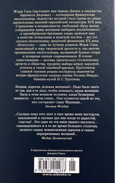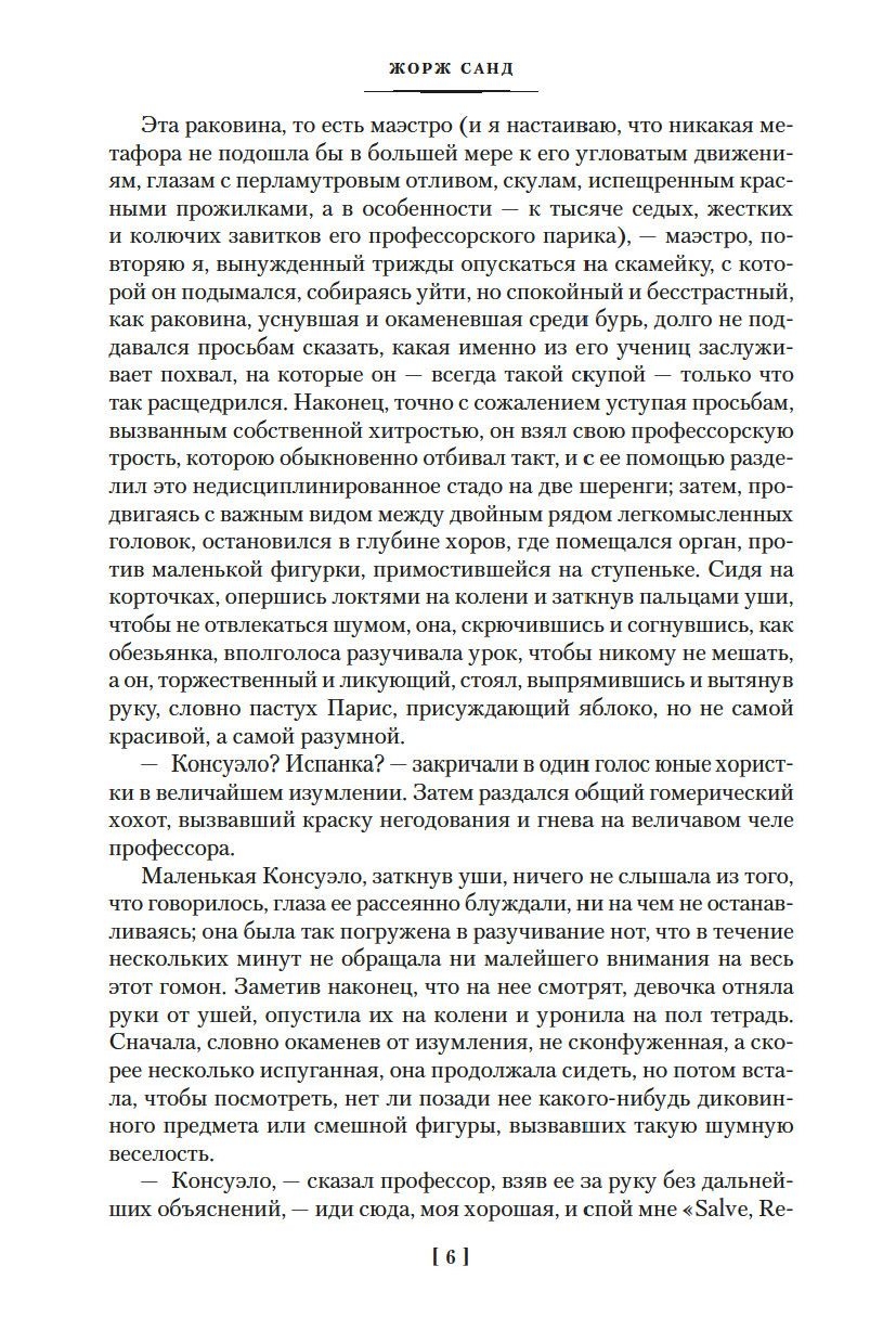 George Sand (real name Aurora Dupin, married Baroness Dudevan) - a legendary French writer, whose work became one of the most significant phenomena of European literature of the XIX century. The desire for independence, a free lifestyle, the assertion of a woman's right to choose a lover and disregard for marriage bonds, a male name as a pseudonym and male costume - all this made the writer a forerunner of feminism of the XX century. "Consuelo" - one of the best novels of George Sand, written in the period of creative maturity and, like many works of the writer, caused heated controversy and polar assessments of contemporaries. At the heart of the story - the motifs of the tragic collision of the artist and society, the difficult choice between career, success and quiet family life. The prototype of the protagonist of the novel was the famous Spanish-French opera singer Pauline Viardot, former muse of I. S. Turgenev. S. Turgenev.