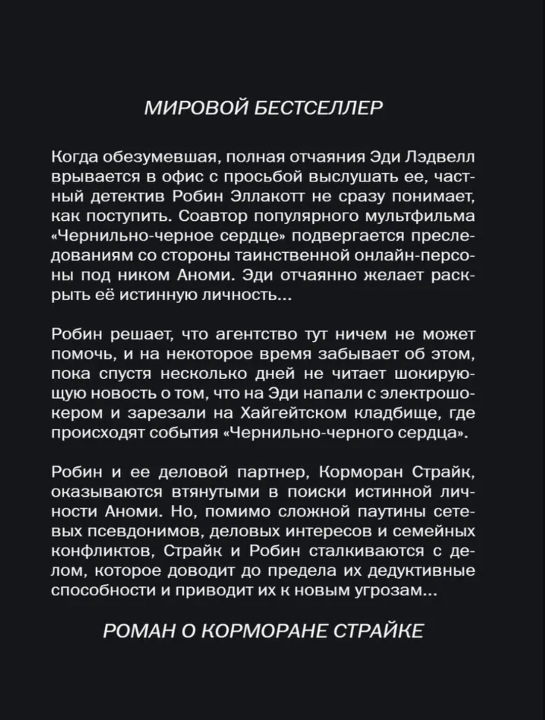 Edie Ledwell, creator of the popular cartoon "Inkblack Heart," contacts Strike and Robin's agency. She tells of cyberbullying and asks Robin to help her find a man nicknamed "Anomie," whose online harassment drove her to attempt suicide. He writes vile rumors about her, accuses her of every mortal sin, and suggests she continue her attempts to take her own life. Robin, citing the agency's full schedule, suggests she contact someone who specializes in cybercrime. The woman leaves, but shortly afterward, the media reports her death – Edie was brutally murdered in a cemetery, and her partner in the cartoon, Josh Blay, was taken to the hospital in critical condition.