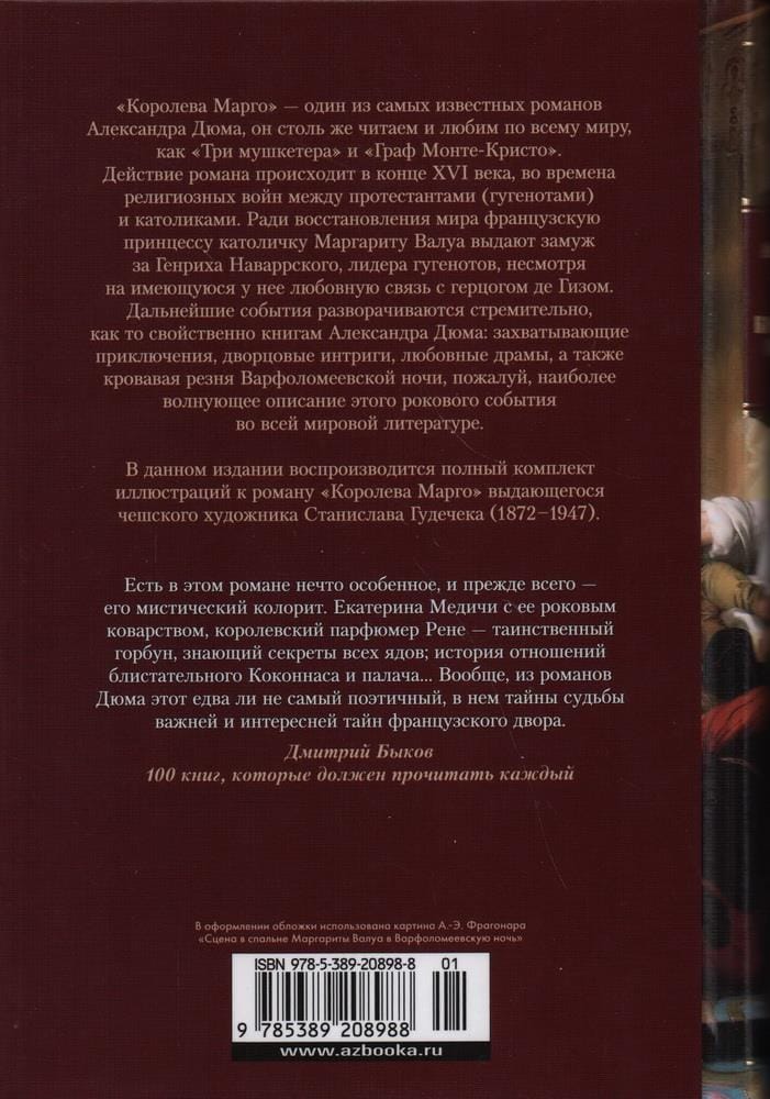 "Queen Margot" - one of the most famous novels of Alexandre Dumas, it is as read and loved around the world as "The Three Musketeers" and "The Count of Monte Cristo". The action of the novel takes place at the end of the XVI century, at the time of religious wars between Protestants (Huguenots) and Catholics. For the sake of restoring peace, the French princess, Catholic Marguerite de Valois is given in marriage to Henry of Navarre, the leader of the Huguenots, despite her love affair with the Duke of Guise. Further events unfold rapidly, as is typical of Alexandre Dumas's books: thrilling adventures, palace intrigue, love dramas, and the bloody massacre of Bartholomew's Night, perhaps the most stirring description of this fateful event in all of world literature. This edition reproduces the complete set of illustrations for Queen Margot by the outstanding Czech artist Stanislav Gudeček (1872-1947).