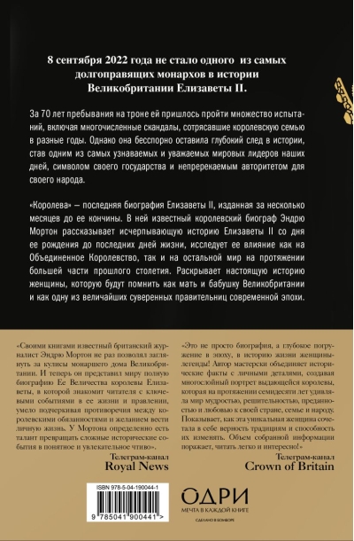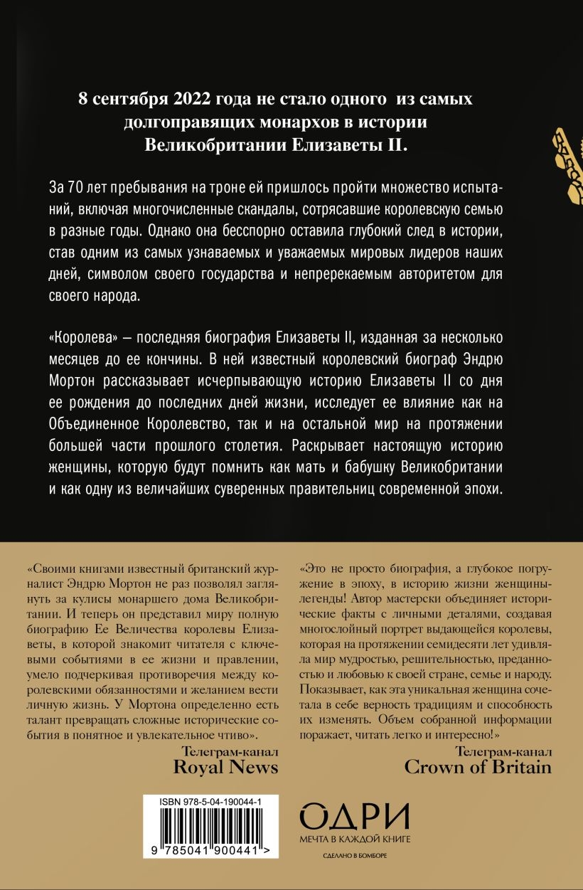 "The Queen" is the final biography of Elizabeth II, published just months before her death. In it, renowned royal biographer Andrew Morton tells the exhaustive story of Elizabeth II from her birth to her final days, exploring her impact on both the United Kingdom and the rest of the world over much of the last century. It reveals the true story of a woman who will be remembered as the mother and grandmother of Great Britain and as one of the greatest sovereign rulers of the modern era.