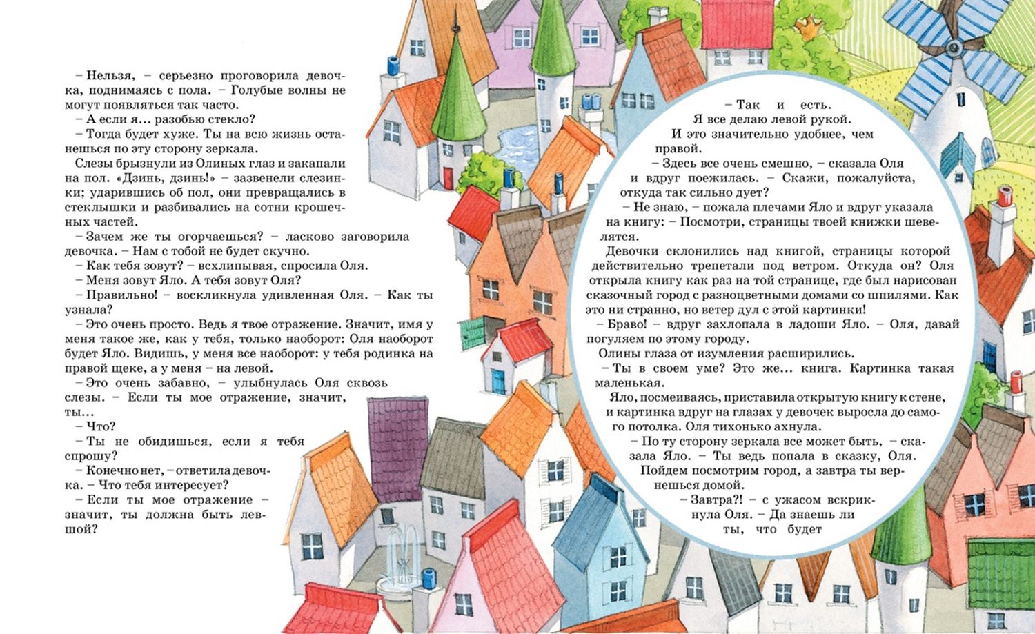 One day, a girl named Olya stepped through a mirror and found herself in the Kingdom of Crooked Mirrors, where she had to endure many dangerous adventures. She managed to see herself from the outside, meeting a girl named Yalo, who was exactly like her. Watching this girl as if she were herself, Olya was able to get rid of the shortcomings that she had not noticed in herself before.