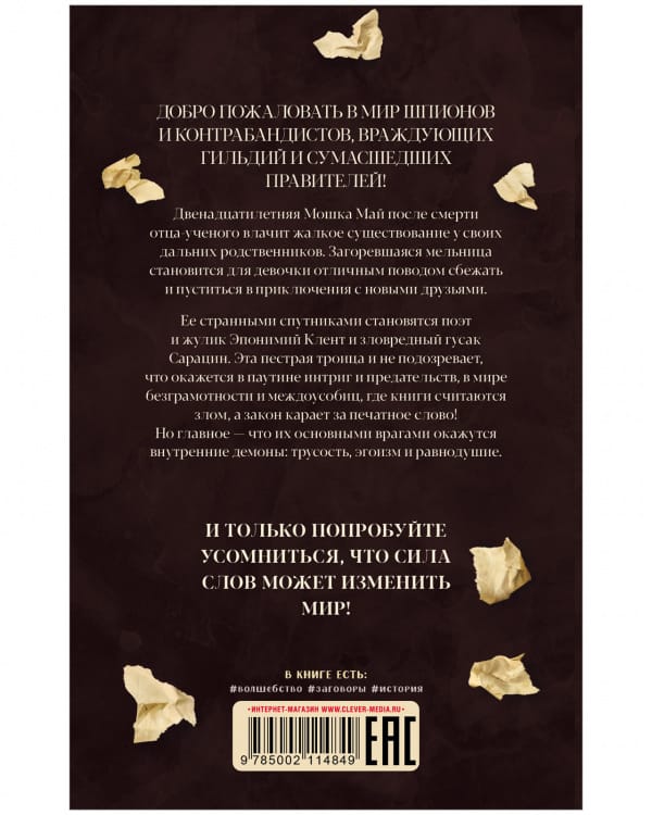Twelve-year-old Moshka Mai, after the death of her scientist father, lives a miserable existence with her distant relatives. When the mill catches fire, the girl has the perfect excuse to run away and embark on an adventure with new friends. Her strange companions are the poet and rogue Eponymius Klent and the malicious goose Saracen. This motley trio has no idea that they will find themselves in a web of intrigue and treachery, in a world of illiteracy and infighting, where books are considered evil and the law punishes the printed word! But the main thing is that their main enemies will be their inner demons: cowardice, selfishness and indifference.