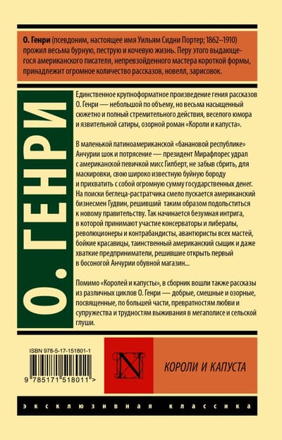 The only large-format work of the genius of stories O. Henry - a small in volume, but very rich in plot and full of fast-paced action, fun humor and sarcastic satire, mischievous novel "Kings and Cabbage. In a small Latin American "banana republic" Anchuria shock and dismay - President Miraflores ran away with the American singer Miss Gilbert, not forgetting to shave, for disguise, his well-known riotous beard and take with him a huge amount of public money. The American businessman Goodwin boldly sets out to find the fugitive embezzler, who has decided to suck up to the new government in this way. So begins a mad intrigue, which involves conservatives and liberals, revolutionaries and smugglers, adventurers of all stripes, vivacious beauties, a mysterious American detective and even the savvy entrepreneurs who decided to open the first shoe store in barefoot Anchuria... In addition to "Kings and Cabbages", the collection also includes stories from various cycles of O. Henry. Henry - kind, funny and mischievous, mostly devoted to the vicissitudes of love and marriage and the difficulties of survival in the metropolis and rural wilderness.