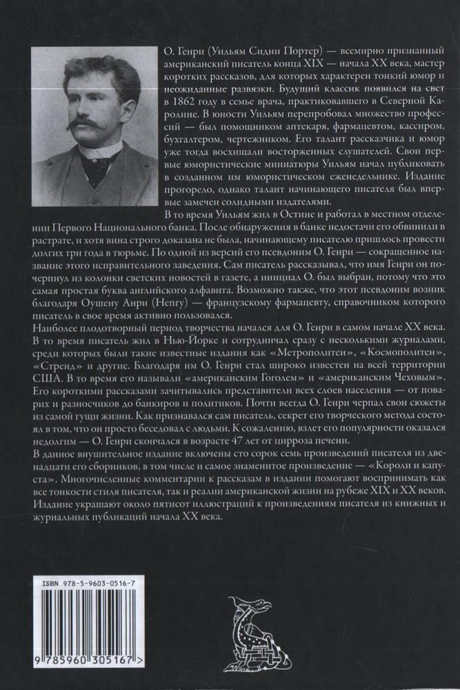O. Henry (William Sidney Porter) is a world-renowned American writer of the late XIX - early XX century, a master of short stories, which are characterized by subtle humor and unexpected endings. The future classic was born in 1862 in the family of a doctor who practiced in North Carolina. In his youth, William tried many professions - he was an assistant pharmacist, pharmacist, cashier, accountant, draftsman. His talent for storytelling and humour even then delighted enthusiastic listeners. William began to publish his first humorous miniatures in the humorous weekly he created. The publication burned out, but the talent of the aspiring writer was first noticed by reputable publishers. At the time, William lived in Austin and worked at the local branch of the First National Bank. After finding a shortage in the bank, he was accused of embezzlement, and although guilt was not strictly proven, the aspiring writer had to spend three long years in prison. According to one version, his pseudonym O. Henry is an abbreviated name of this correctional institution. The writer himself said that the name Henry he got from the column of secular news in the newspaper, and the initial O. was chosen because it is the simplest letter of the English alphabet. It is also possible that this pseudonym arose thanks to Ocean Henry, a French pharmacist, the directory of which the writer at one time actively used. The most fruitful period of creativity began for O. Henry at the very beginning of the XX century. At that time, the writer lived in New York and collaborated with several magazines, including such famous publications as the Metropolitan, Cosmopolitan, Strend and others. O. Henry became widely known throughout the United States. At that time he was called "American Gogol" and "American Chekhov". His short stories were read by representatives of all segments of the population - from cooks and peddlers to bankers and politicians. Almost always O. Henry drew his stories from the thick of life. The secret of his creative method was that he was just talking to people. Unfortunately, the rise of his popularity was short-lived - O. Henry died at the age of 47 from cirrhosis of the liver. This impressive edition includes one hundred and forty-seven works of the writer from twelve of his collections, including the most famous work - "Kings and cabbage". Numerous comments on stories in the publication help to perceive both all the subtleties of the writer’s style and the realities of American life at the turn of the XIX and XX centuries. The publication is decorated with about five hundred illustrations to the works of the writer from book and magazine publications of the early XX century. The book includes the novel “Kings and Cabbage” and selected novels of the classic of American literature by O. Henry (William Sidney Porter) (1862-1910).