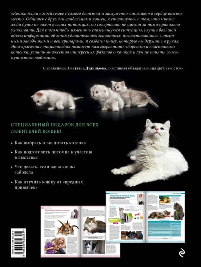 This unique encyclopedia is a real gift for all cat lovers! It will help you choose the right pet and provide it with everything it needs for a happy life in a new home. The publication contains detailed information about feline anatomy and psychology, as well as answers to the most pressing questions related to the education of your pet, so you can better understand the needs and habits of your pet, monitor its health and provide first aid in an emergency.