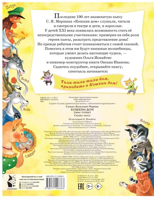 For the past 100 years, S. Ya. Marshak's famous play "The Cat's House" has been heard, read, and watched in the theater by both children and adults. Children in the 21st century now have the opportunity to become directly involved: try on the roles of the play's characters and perform the performance at home! But first, children should get acquainted with the fairy tale itself. Helping them do so will be book sorceresses who know how to work true miracles—the artist Olga Ionaitis and the book's design engineer, Oksana Ivanova. Sit back, open your book, the performance begins: Tili-tili-tili-bom, come to the Cat's House!