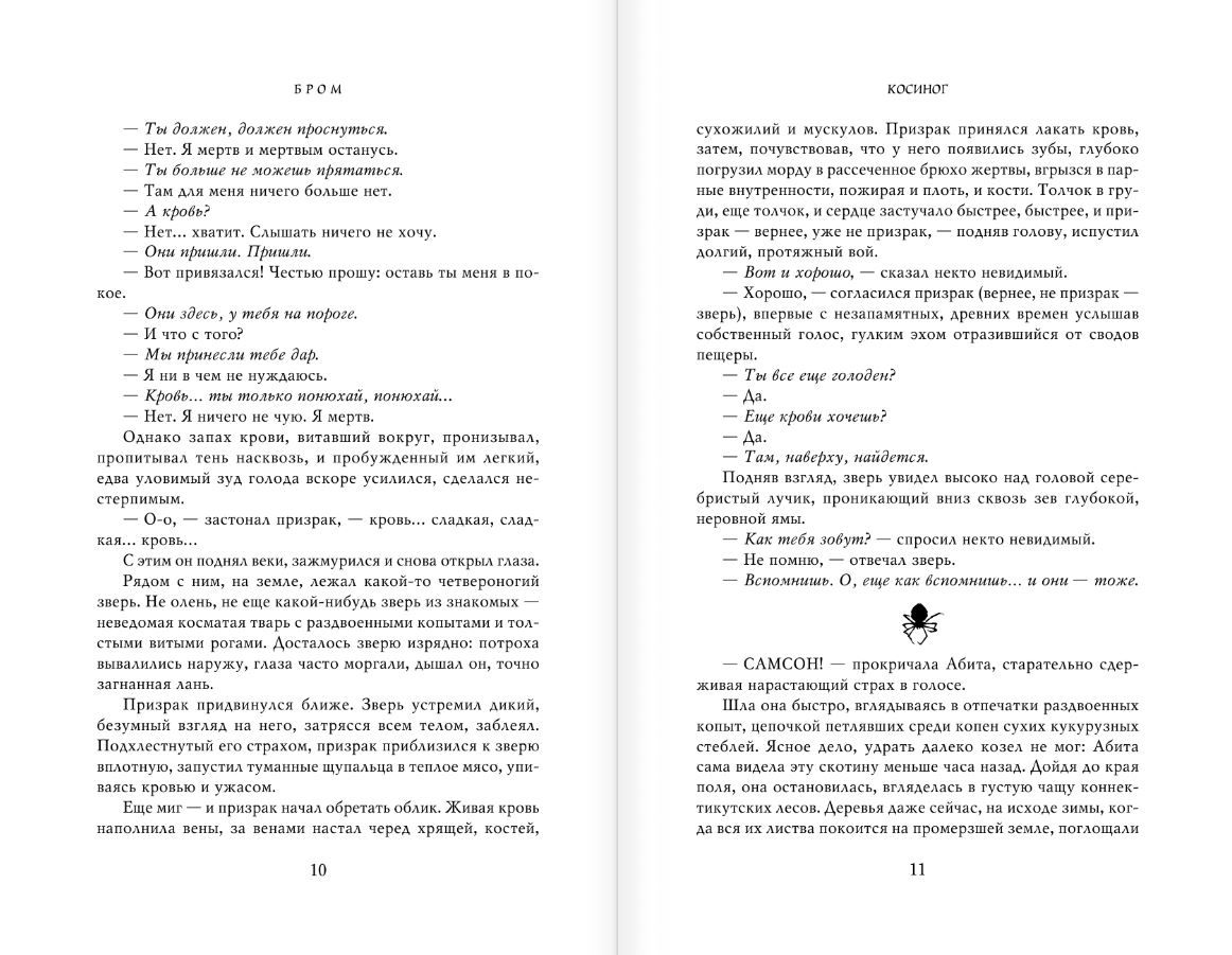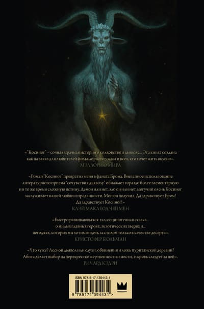 Connecticut, 1666 In a dark forest, an unknown ancient spirit awakens to life. The wild people call him Father, intercessor, destroyer. The colonists call him Cosinog, the demon, the devil. But for Abita, recently widowed, rejected, lonely and defenseless in the face of her pious fellow villagers, he is the only one to whom she can turn for help. The two of them begin a battle, a battle between pagans and Puritans that threatens to raze the village to the ground, leaving nothing but ashes and spilled blood. A haunting tale of magic, this book is embellished with more than two dozen of Brom's mesmerizing, eerie paintings, taking the reader into his savage, ruthless world.