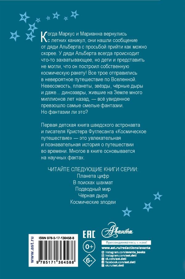 The book "Space Travels" by Swedish astronaut and writer Christer Fuglesang is the first of six fascinating tales about the adventures of scientist Uncle Albert and his children - Marcus and Marianne. The heroes of this book will make an amazing and informative journey through the universe, get acquainted with planets, stars and black holes, and even... find themselves on Earth during the time of the dinosaurs! Much of the story is based on real facts, which the author will tell at the end of the book. For elementary school age.