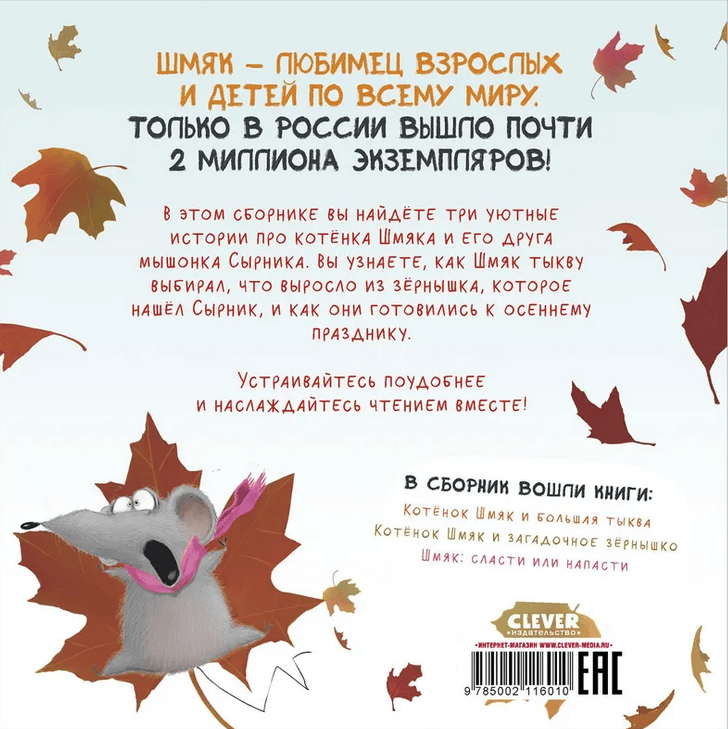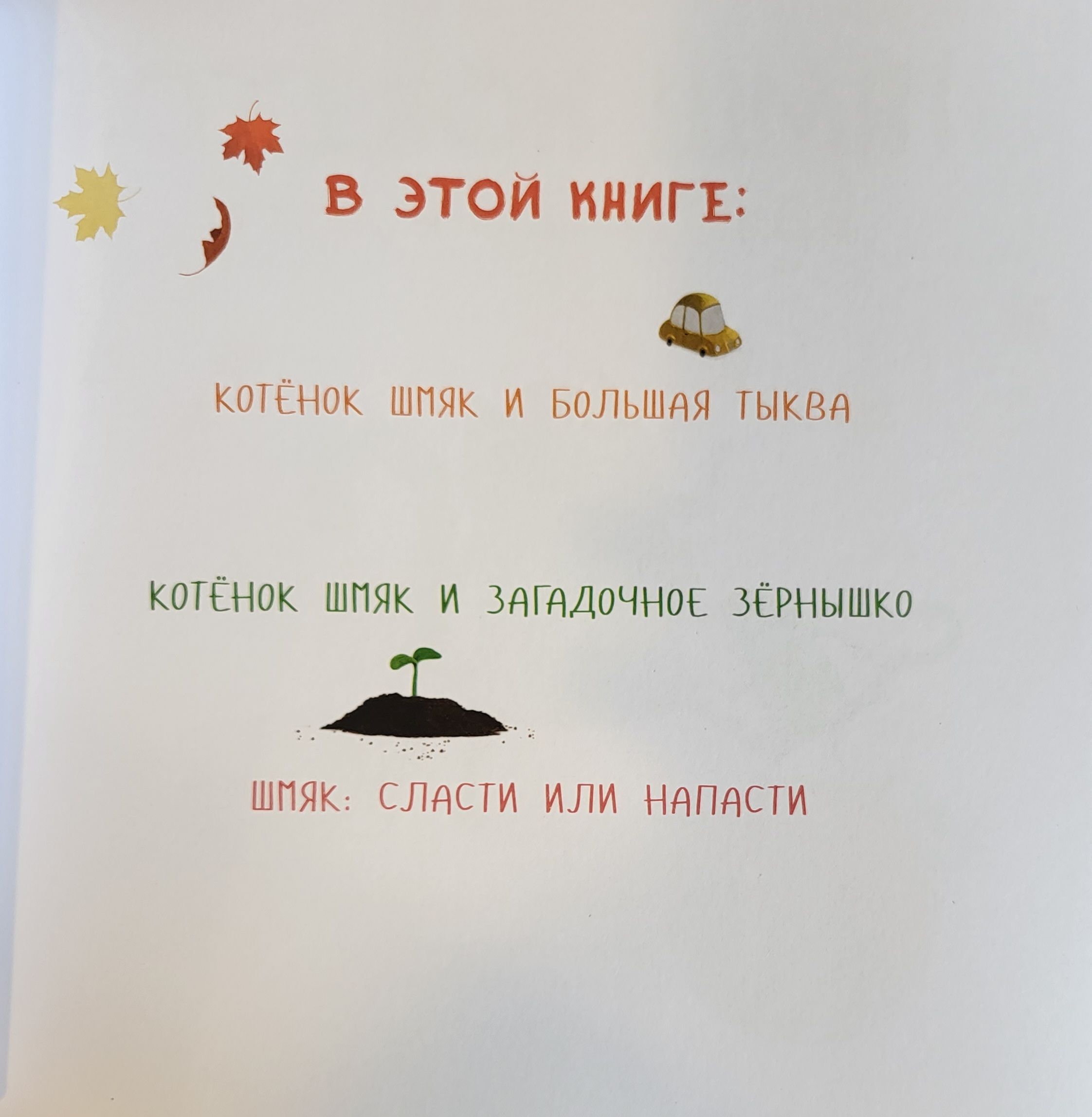 In this anthology you will find three cozy stories about Shmyak the kitten and his friend Cheesernik the mouse. You'll learn how Shmyak picked a pumpkin, what grew from the seed that Cheesernik found, and how they prepared for the fall festival.