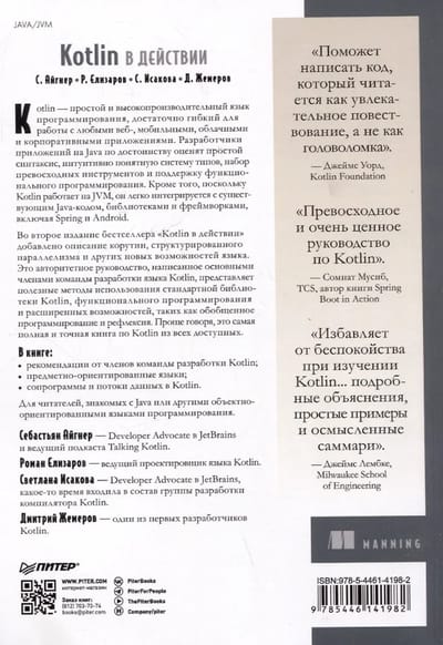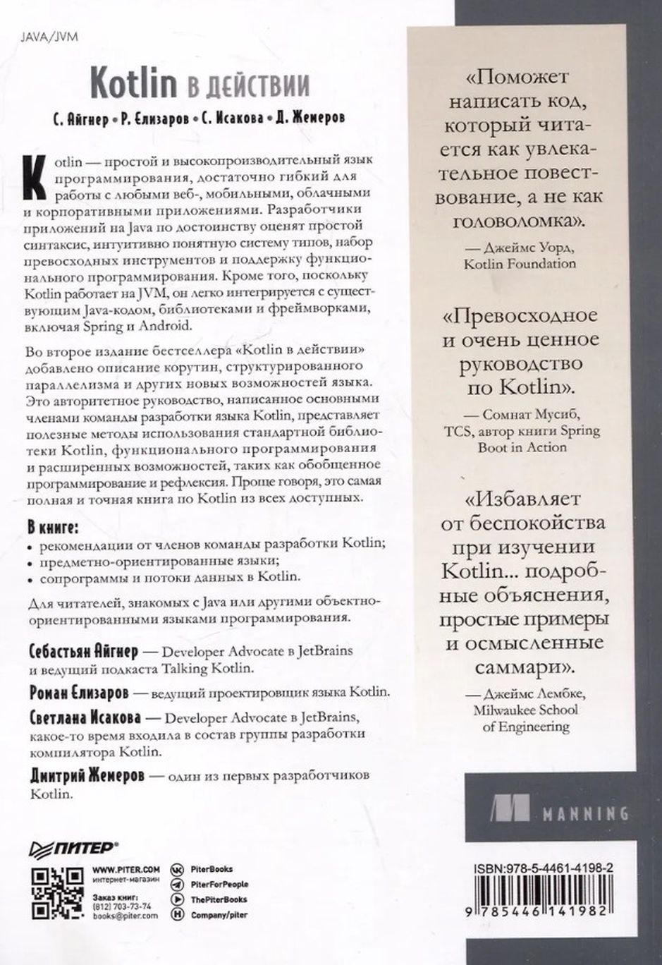 The second edition of the best-selling Kotlin in Action adds coroutines, structured concurrency, and other new language features. Written by core members of the Kotlin language team, this authoritative guide introduces useful techniques for using the Kotlin standard library, functional programming, and advanced features like generics and reflection. Simply put, it’s the most complete and accurate book on Kotlin available.