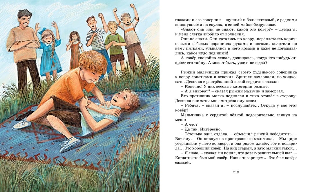 Vladislav Petrovich Krapivin is a remarkable writer who became a classic during his lifetime, the winner of numerous literary prizes and the founder of the International Children's Literature Prize, which bears his name. The works of the writer have been translated into many languages of the world, some of them have been screened, and the most complete collection of his works numbers 50 volumes. In the story "Airplane Carpet" the writer seems to return to the past, becoming a ten-year-old boy, who together with his old friend wanders through the streets of his native city and even flies over it on an airplane carpet. It's a tale of childhood that every child has. In the end, the real miracle that the heroes of the story discover is not the magic carpet at all, but their readiness to help others and strong friendship that lasts through life.
