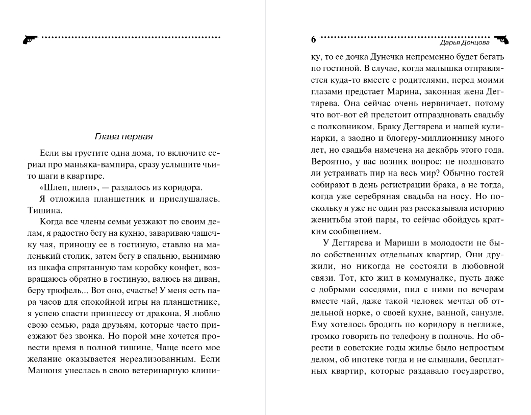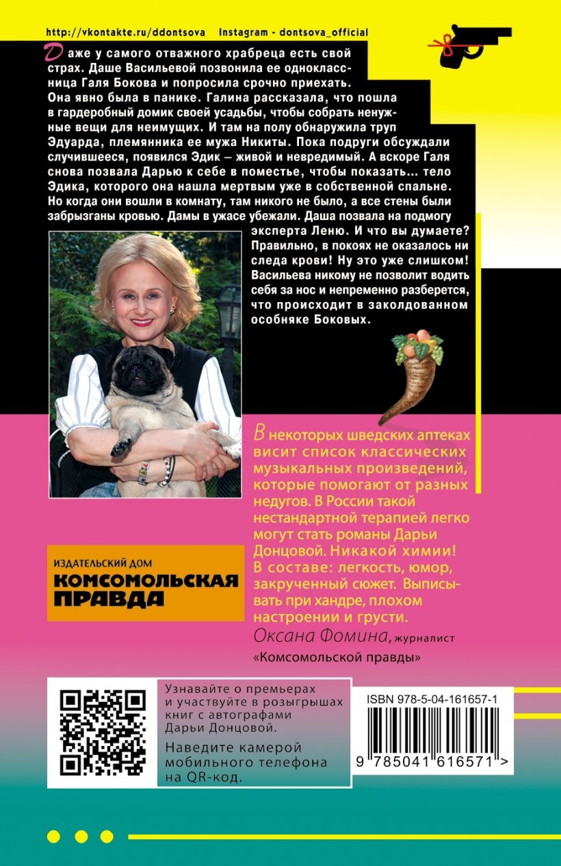 Even the bravest brave has his fear. Dasha Vasilieva received a call from her classmate Galya Bokova asking her to come urgently. She was clearly in a panic. Galina said that she went to the checkroom of her estate to collect unnecessary things for the poor. And there on the floor she found the corpse of Eduard, the nephew of her husband Nikita. While the friends discussed what had happened, Edik appeared - alive and unharmed. And soon Galya again called Daria to his estate to show ... the body of Edik, whom she found dead already in his own bedroom. But when they entered the room, there was no one there, and all the walls were splattered with blood. The ladies ran away in terror. Dasha called the expert Lenya for help. And what do you think? That's right, there wasn't a trace of blood in the room! This is too much! Vasilieva will not let anyone lead her around, and will certainly figure out what is going on in the enchanted mansion of the Bokovs.