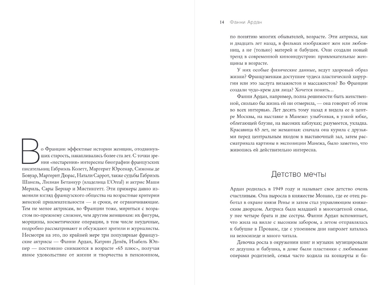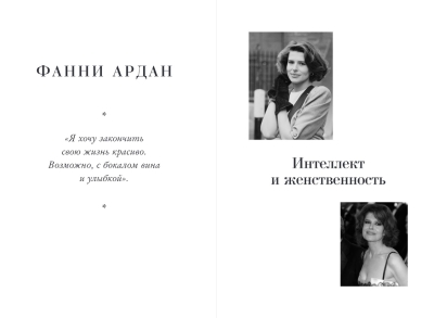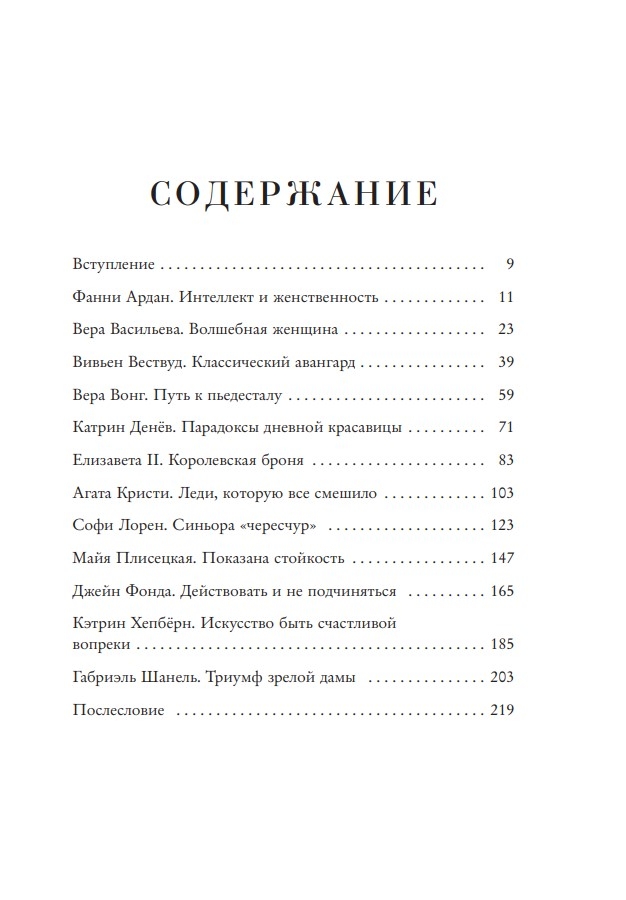 Before you is a beautifully presented gift edition about 12 great women: Fanny Ardant, Maya Plisetskaya, Gabrielle Chanel, Jane Fonda, Katherine Hepburn, Sophia Loren, Vera Vasilyeva, Agatha Christie, Vivienne Westwood, Elizabeth II, Vera Wang, and Catherine Deneuve. The book features unique photographs of them throughout the years, as well as each heroine's life rules that helped them maintain their vitality and unquenchable zest for life.