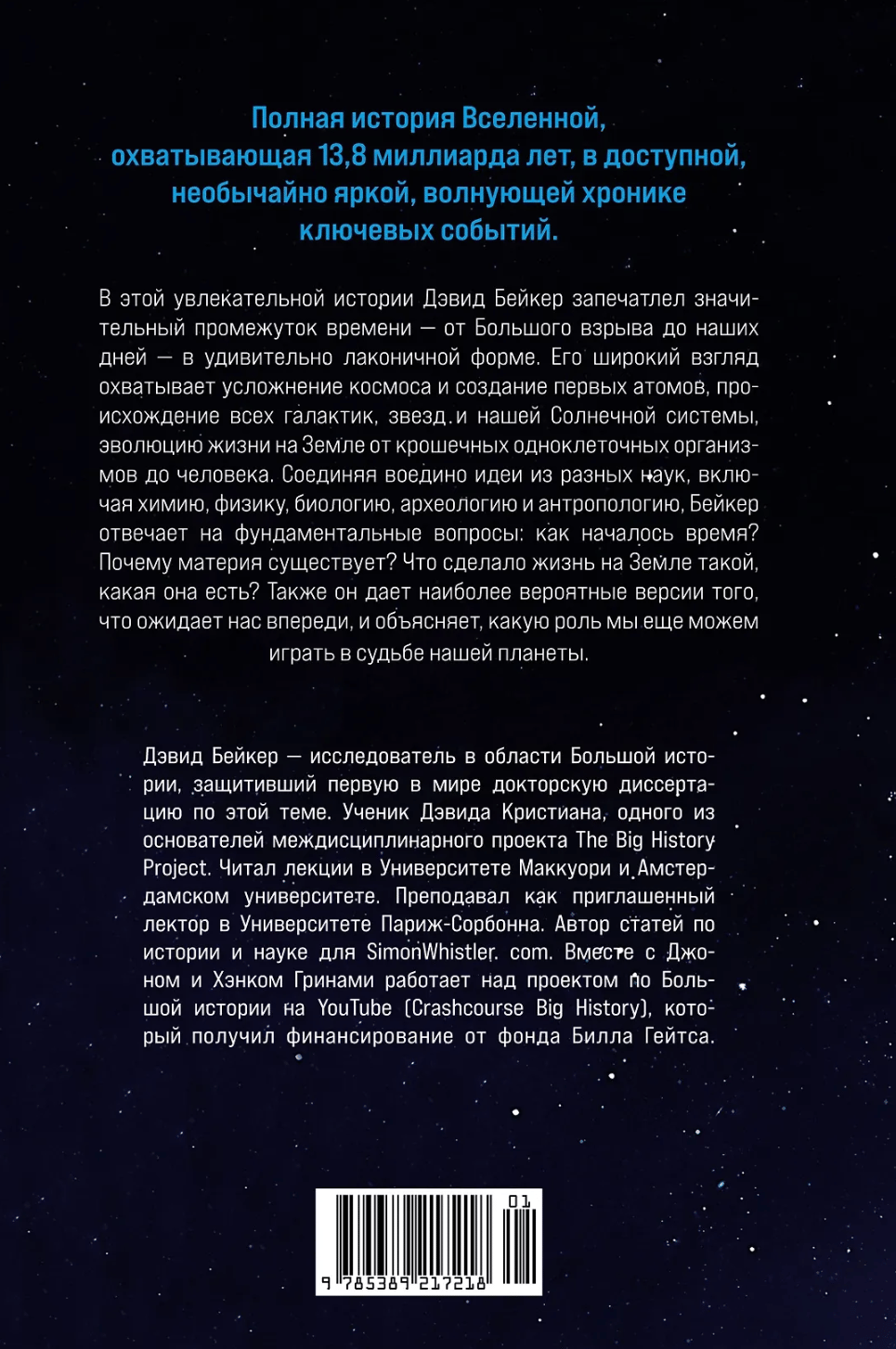 This book tells the story of the process of historical change of all elements in the cosmos from the Big Bang to the evolution of life and human history - how simple clumps of hydrogen evolve into complex human societies. History usually allows us to live many lives instead of one, but this particular story offers the experience of billions of years... As for the future, I am talking about the next century, the next thousand years, the next million, billion, and even trillion and quadrillion years, until the potential end of our universe