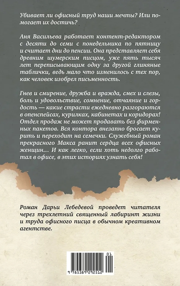 Does office work kill our dreams? Or does it help us achieve them? Anya Vasilyeva works as a content editor from ten to seven, Monday through Friday, counting down the days until retirement. She imagines herself as an ancient Sumerian scribe, copying clay tablets one after another for five thousand years, because little has changed since humans invented writing.