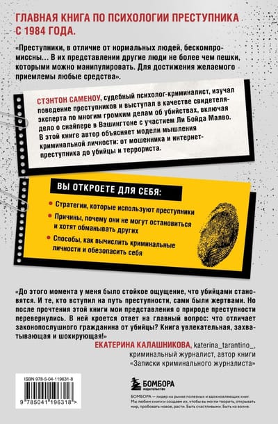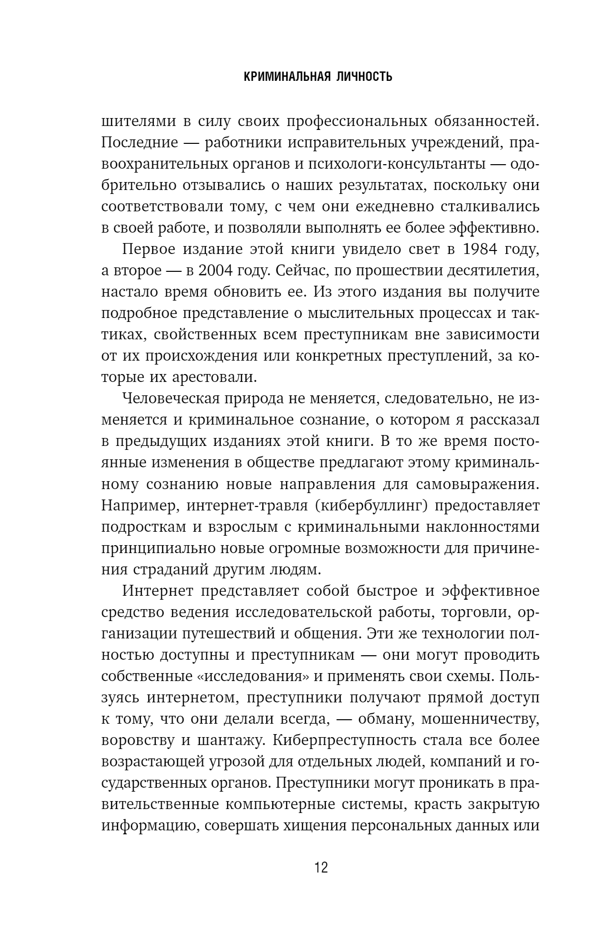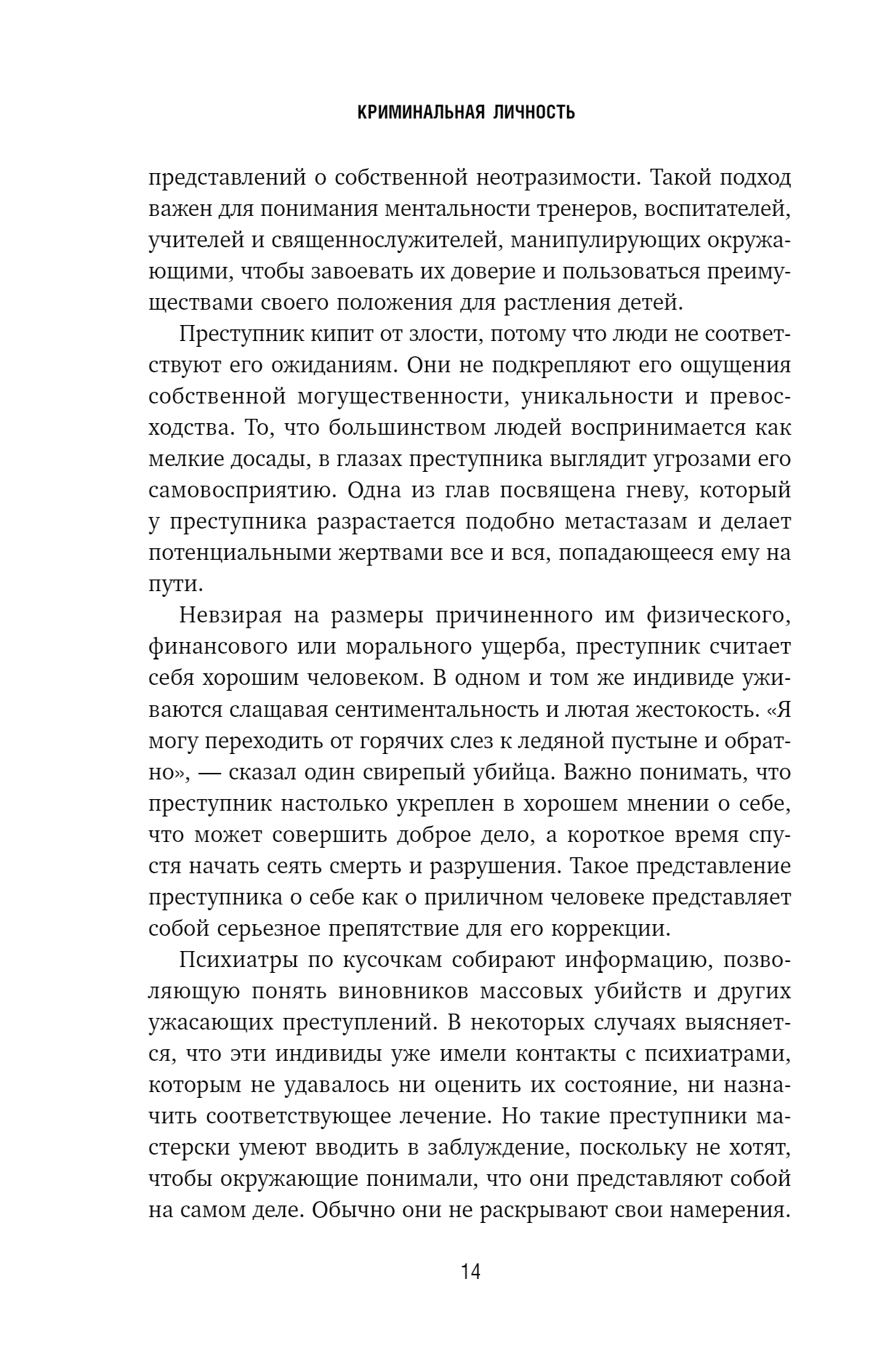 Stanton Samenow, a human behaviorist who has spent 44 years researching the minds of criminals, explains the thinking patterns of the criminal personality: from the fraudster and the Internet criminal to the murderer and the terrorist. You will be convinced: what you knew before is fundamentally wrong. You will discover: - the strategies criminals use; - the reasons why they can't stop and want to defraud others; - ways to figure out criminal personalities and keep yourself safe.