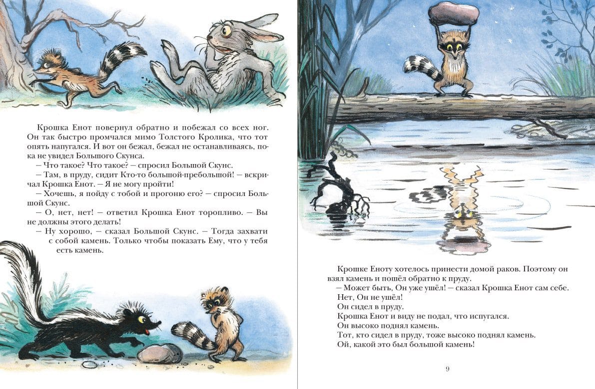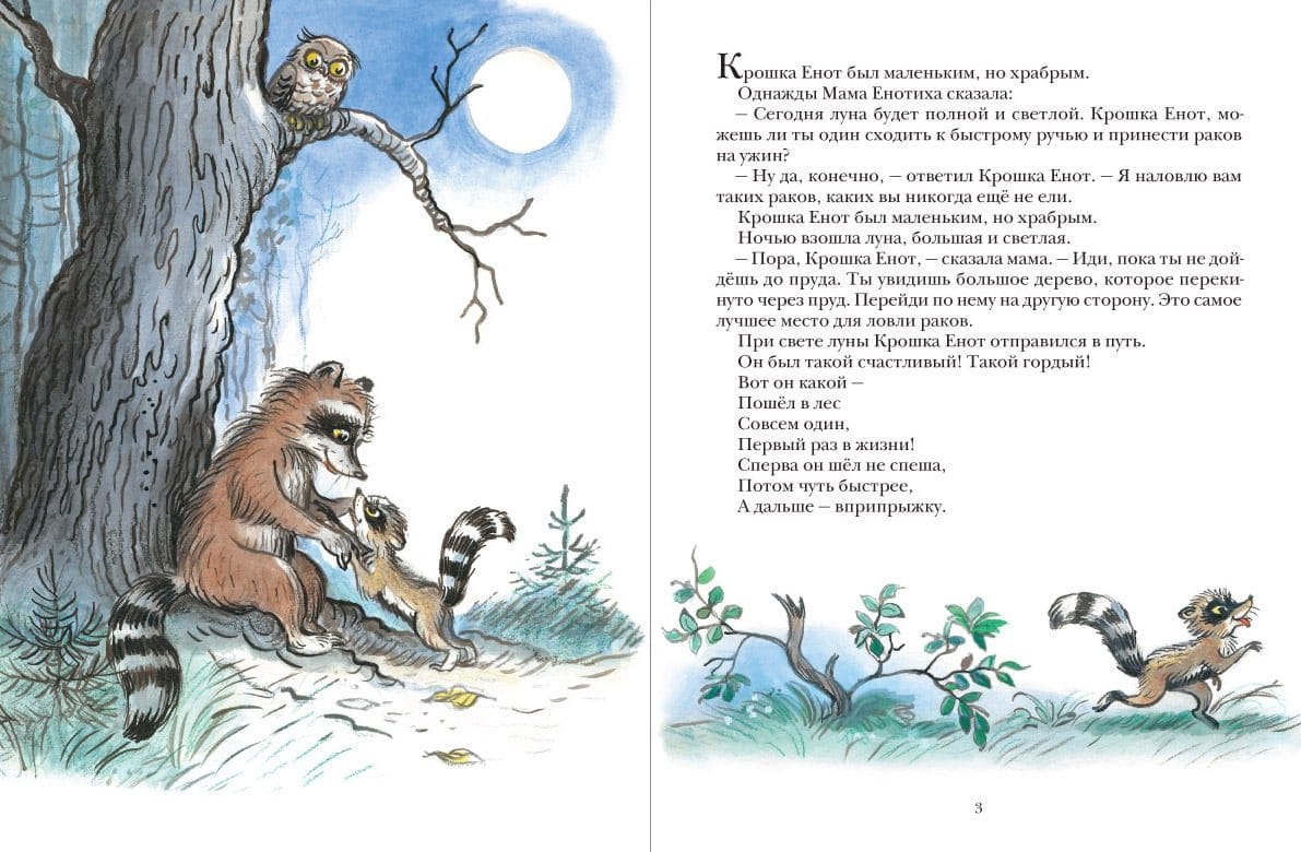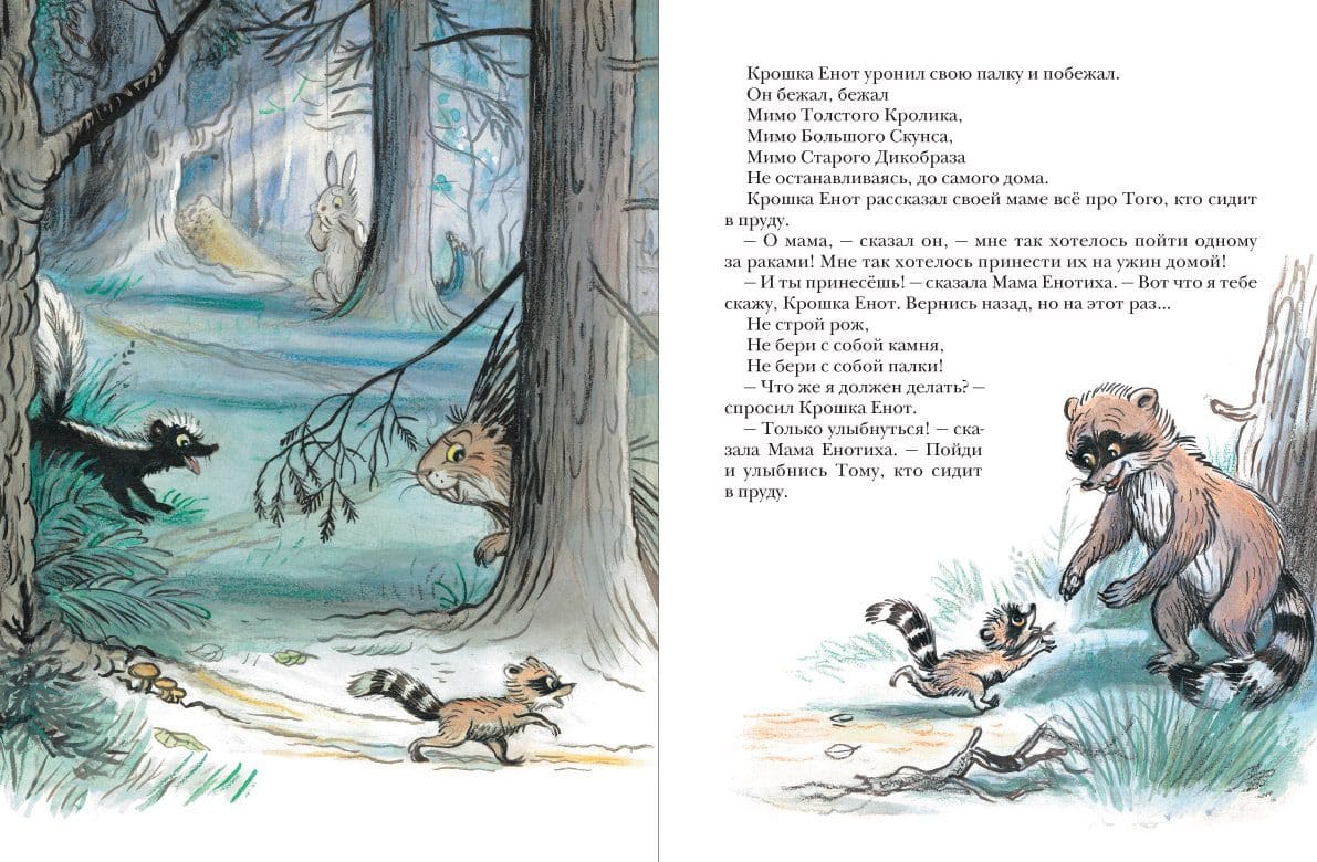Mommy gives Tiny Raccoon a task to go to the pond alone, in the dark, and catch delicious crayfish for dinner. Tiny enthusiastically rushes to fulfill his mother's request, but the farther he gets from home, the more frightened he becomes. On the way he meets Porcupine, Skunk and Fat Rabbit, who frighten him with a story about the One who sits in the pond. But Tiny bravely steps onward.