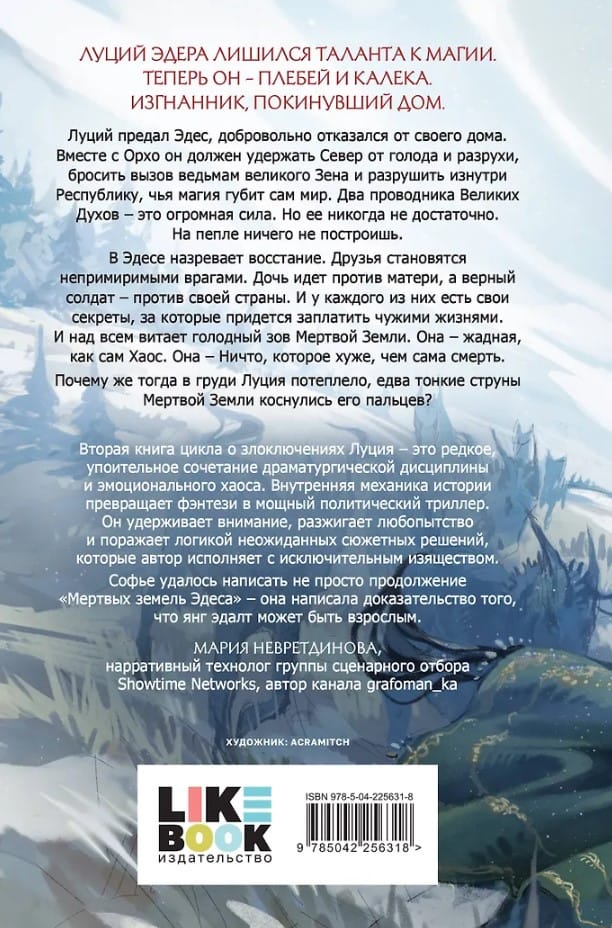 Lucius betrayed Edes, voluntarily abandoning his home. Now the blood of Tal flows in him—but even among the nomads, he remains a stranger. Together with Orkho, he must keep the North from famine and devastation, challenge the witches of the great Zen, and destroy from within the Republic, whose magic is destroying the world itself. Two conduits of the Great Spirits are a formidable force. But force is never enough. Nothing can be built on ashes.