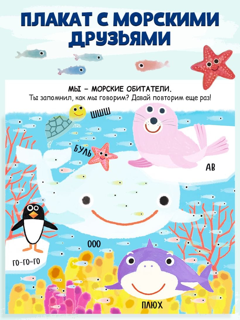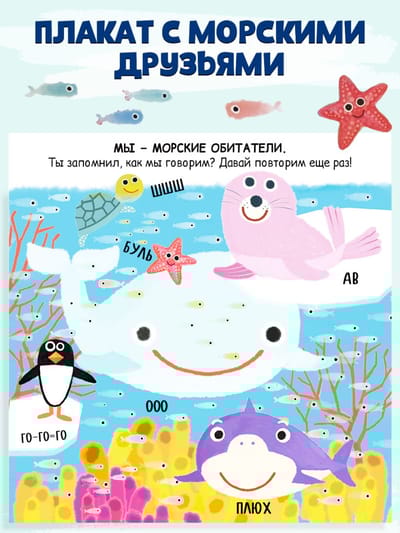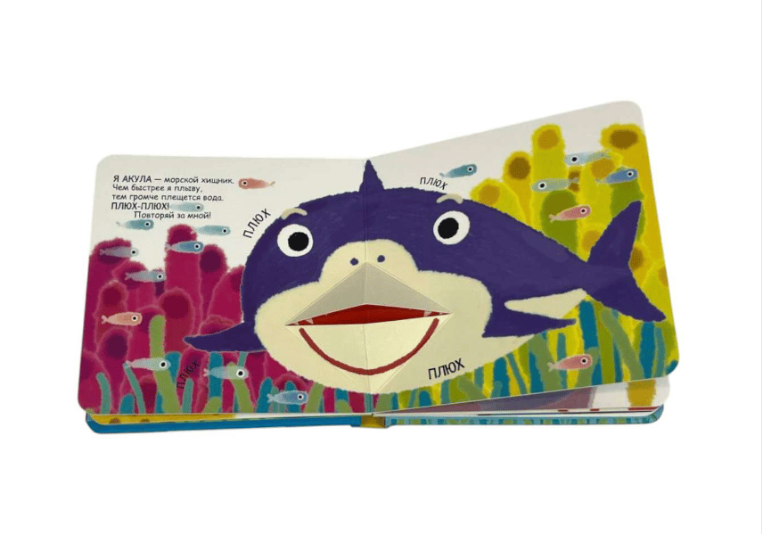 Fun pictures, colorful design, interactive elements, and fun, safe "bites" await you. And at the end, there's a poster with all the sea friends.