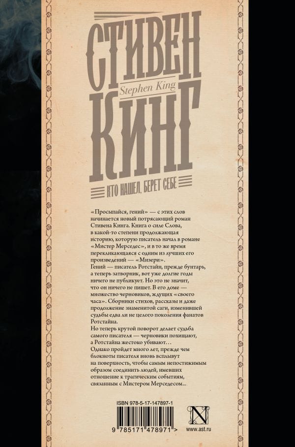 "Wake up, genius" - with these words Stephen King's stunning new novel begins. A book about the power of the Word, in some ways continuing the story that the writer began in the novel "Mr. Mercedes", and at the same time echoing one of his best works - "Misery". Genius writer Rothstein, formerly a rebel and now a recluse, hasn't published anything for years. But that doesn't mean he doesn't write anything. In his house - a lot of drafts, waiting for "his time". Collections of poems, stories and even the continuation of the famous saga, which changed the fate of almost a whole generation of fans of Rothstein. But now the fate of the writer himself takes a sharp turn - the drafts are stolen, and Rothstein is brutally murdered... However, it will take many years before the writer's notebooks will resurface again to connect people who had something to do with the tragic events associated with Mr. Mercedes in the most unfathomable way...