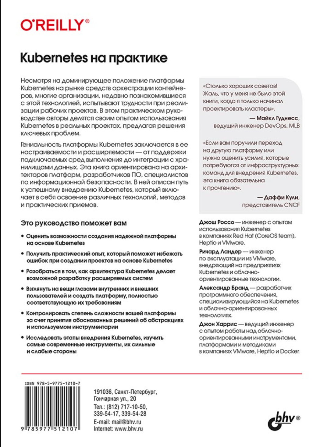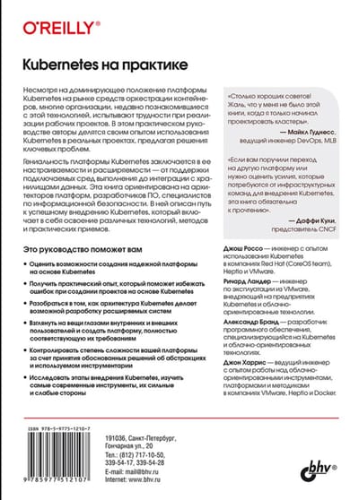 The book is devoted to the practical application of the Kubernetes platform. It examines in detail the Kubernetes architecture and its components. It describes the infrastructure deployment models, its topology, principles of process automation, container runtime, data storage, and network interaction between system elements. It considers the creation and routing of services, management of confidential data, permissions, multi-tenancy, isolation levels, and abstraction. It provides illustrative examples of Kubernetes deployment and container orchestration to solve various practical problems.