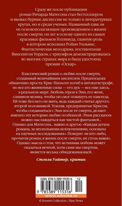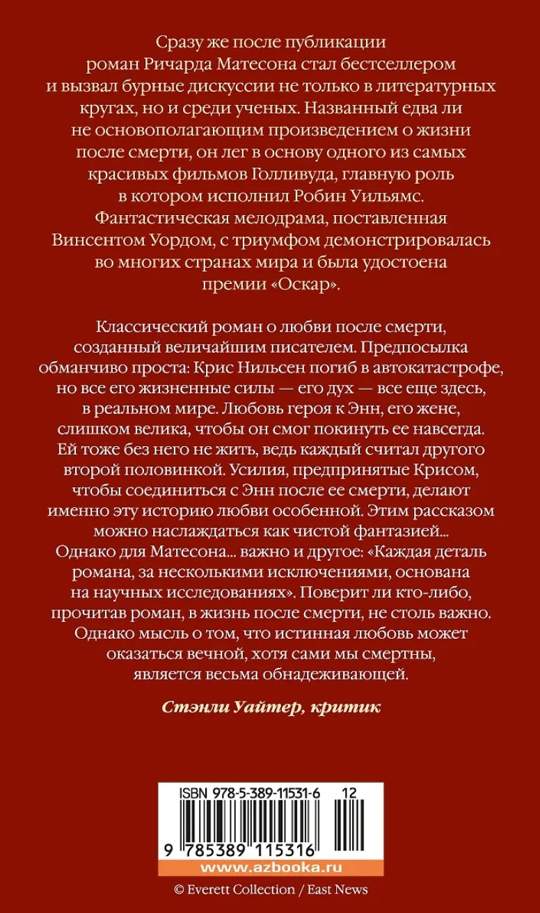 Immediately after its publication, R. Matheson's novel became a bestseller and sparked heated debate not only in literary circles but also among scholars. Called perhaps the seminal work on life after death, it inspired one of Hollywood's most beautiful films, starring Robin Williams. The fantastic melodrama, directed by Vincent Ward, was triumphantly shown in many countries and won an Oscar.