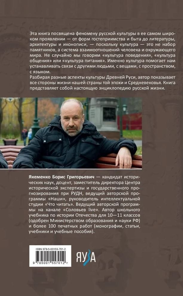 This book is devoted to the phenomenon of Russian culture in its widest manifestation - from forms of hospitality and everyday life to literature, architecture and iconography - because culture is not a set of monuments, but a system of relationships between a person and the surrounding world. It is not by chance that we say "culture of behavior", "culture of communication" or "culture of food". It is culture that helps us to establish connections with other people, with things, with space, with language. Dealing with different aspects of the culture of ancient Russia, the author shows all aspects of life in our country of that era and the Middle Ages. The book is a real encyclopedia of Russian life.