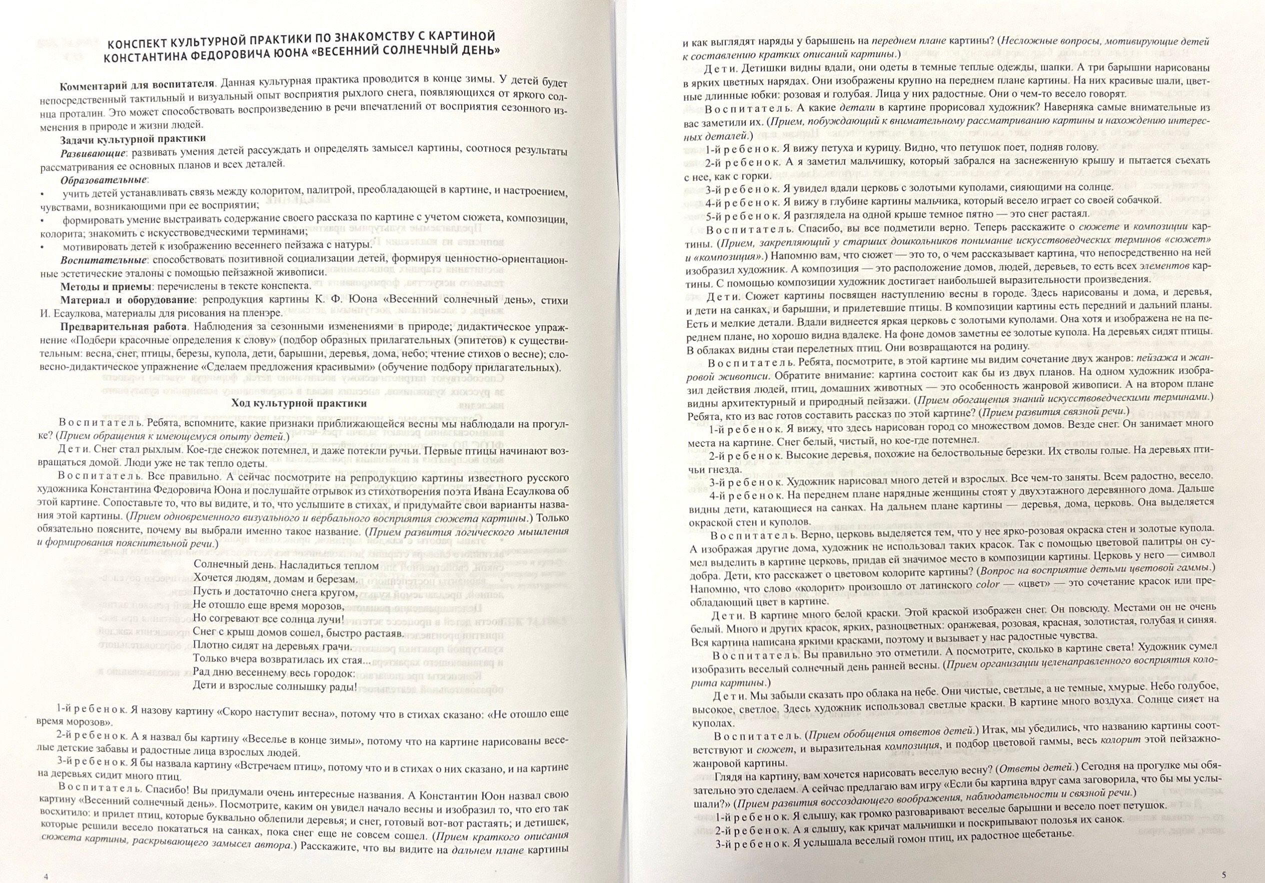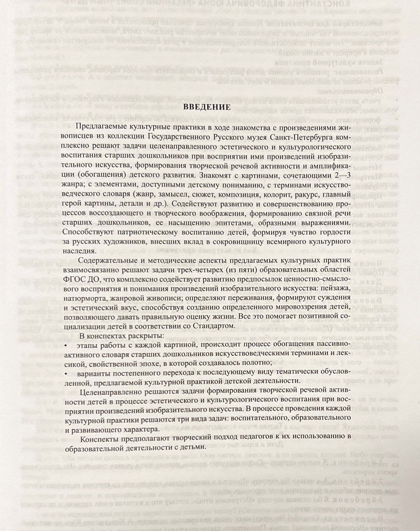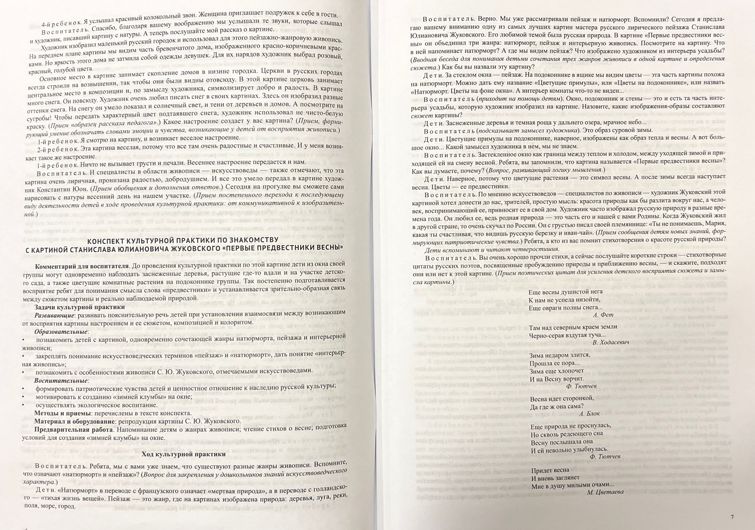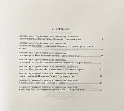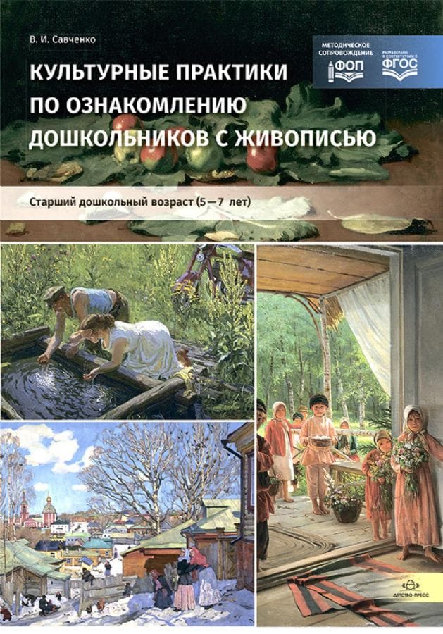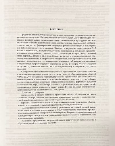 The publication is a collection of notes on cultural practices, during which children familiarize themselves with the works of painters from the collection of the State Russian Museum. Such practices make it possible to solve the tasks of aesthetic and cultural education of senior preschoolers, form their speech culture, promote patriotic education of children, and awaken a sense of pride in Russian artists who have contributed to the treasury of the world cultural heritage. The book contains color reproductions of paintings for demonstration during the lesson. The manual is addressed to educators of ECE centers, teachers of additional education, parents.
