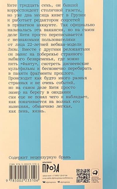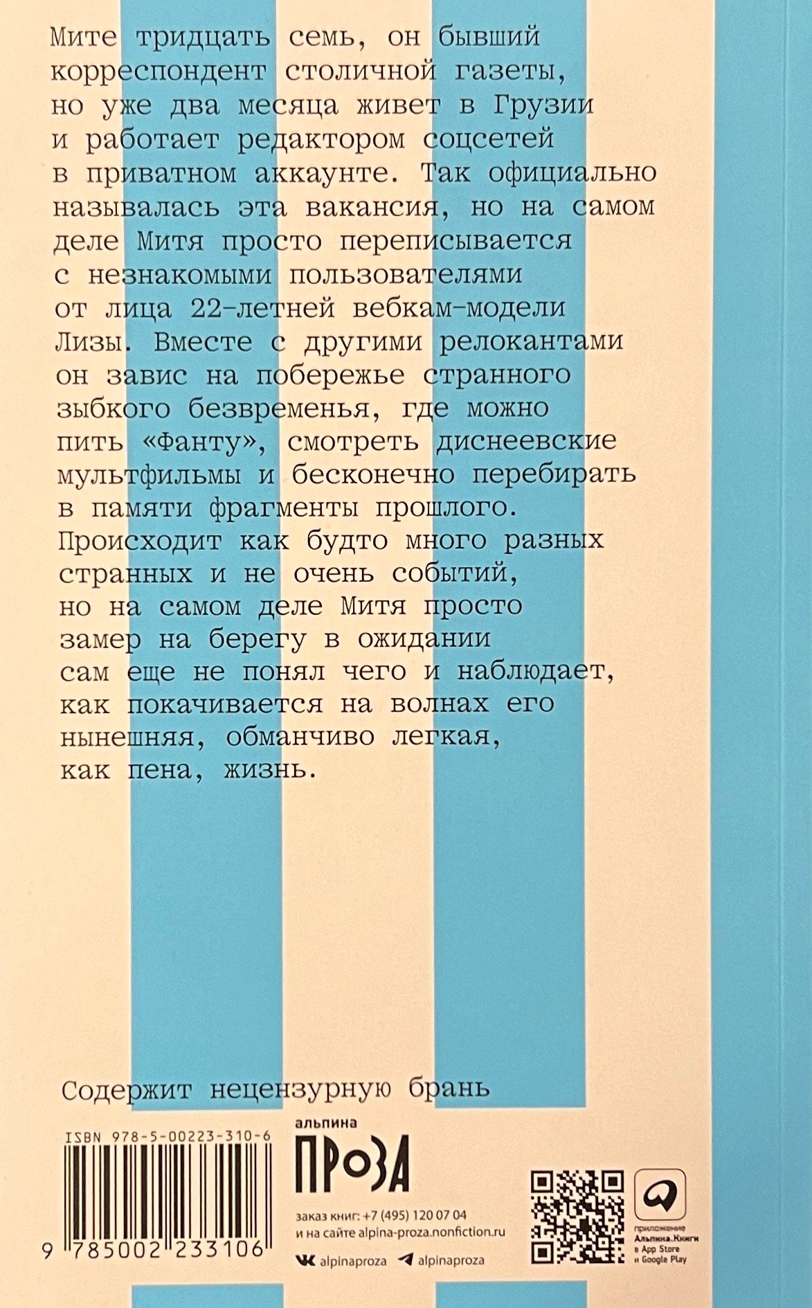 Mitya is thirty-seven, a former correspondent for a newspaper in the capital, but he's been living in Georgia for two months and working as a social media editor in a private account. This is the official name of the job, but in reality Mitya just corresponds with unfamiliar users on behalf of 22-year-old webcam model Lisa. Together with other relocants, he is stranded on the coast of a strange, shaky timelessness, where you can drink Fanta, watch Disney cartoons, and endlessly replay fragments of the past. As if many different strange and not so strange events were taking place, but in fact Mitya just froze on the shore waiting for something he didn't understand yet and watching his present life, deceptively light as foam, swaying on the waves.