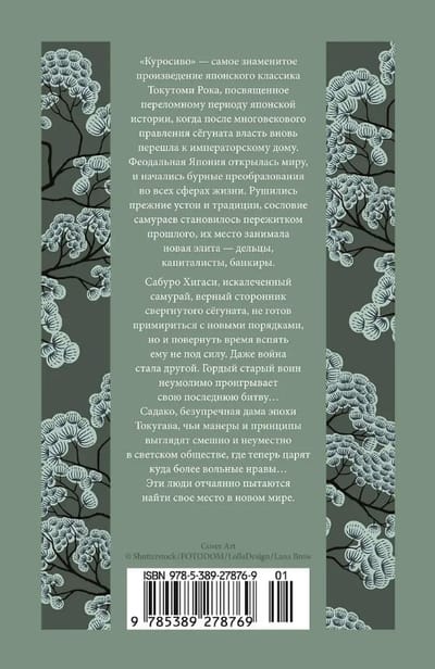 "Kuroshiwo" is the most famous work of the Japanese classic Tokutomi Roka, dedicated to the turning point in Japanese history, when after centuries of shogunate rule, power again passed to the imperial house. Feudal Japan opened up to the world, and turbulent changes began in all spheres of life. The old foundations and traditions collapsed, the samurai class became a relic of the past, their place was taken by a new elite - businessmen, capitalists, bankers. The novel has many characters that replace each other, allowing you to look at events from different angles and making the picture voluminous and polyphonic. But the central characters are people of a bygone era. Saburo Higashi, an elderly, crippled samurai, a loyal supporter of the overthrown shogunate, is not ready to come to terms with the new order, but he is not able to turn back time either. Even the war has become different. The proud old warrior is inexorably losing his last battle... Sadako, the impeccable lady of the Tokugawa era, whose manners and principles look ridiculous and out of place in the new order... These people are desperately trying to find their place in the new world.
