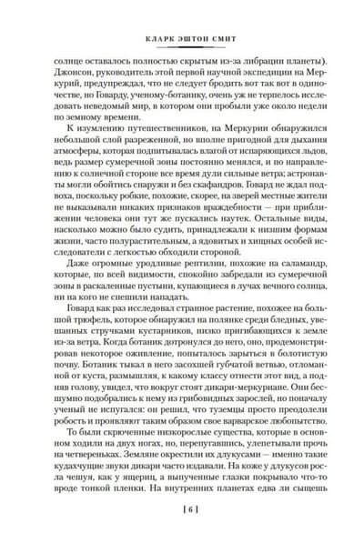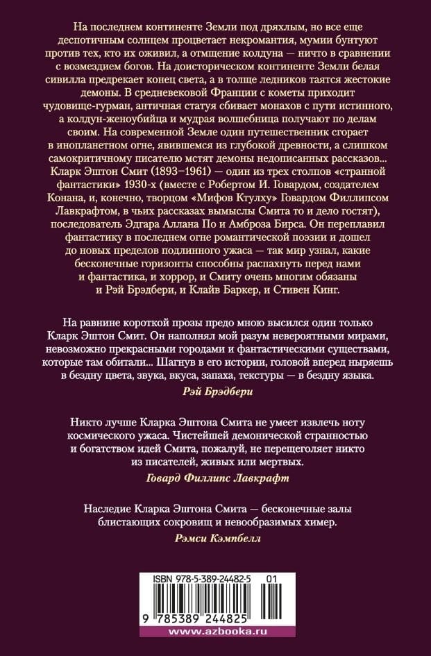 On the last continent of Earth, under a decrepit but still oppressive sun, necromancy thrives, the god of death rules the living, mummies rebel against those who brought them to life, and the vengeance of a sorcerer is nothing compared to the vengeance of the gods. On the prehistoric continent of Earth, a mysterious white sibyl foretells catastrophes, and in the thickness of the glaciers lurk cruel demons. In medieval France, a gourmand monster comes from a comet, an ancient statue leads monks astray, and a witch doctor and a wise sorceress get their work cut out for them. On modern Earth, a collector of the strange is irrevocably immersed in times that predate the primitive, a traveler burns in an alien fire that appeared from deep antiquity, and an overly self-critical writer is avenged by the demons of unfinished stories ... Clark Ashton Smith (1893-1961) - one of the three pillars of "weird fiction" of the 1930s (along with Robert E. Howard, the creator of Conan, and, of course, the creator of "The Cthulhu Mythos" Howard Phillips Lovecraft, in whose stories Smith's fictions now and then visit), a follower of Edgar Allan Poe and Ambrose Bierce. He melted fiction in the last fire of Romantic poetry and reached new limits of true horror - this is how the world learned what infinite horizons both fantasy and horror can open before us, and Smith owes much to Ray Bradbury, Clive Barker, and Stephen King. This collection presents works from 1932-1935, Smith's heyday as a storyteller, as well as his less numerous later texts; most of the stories here are published in new translations.