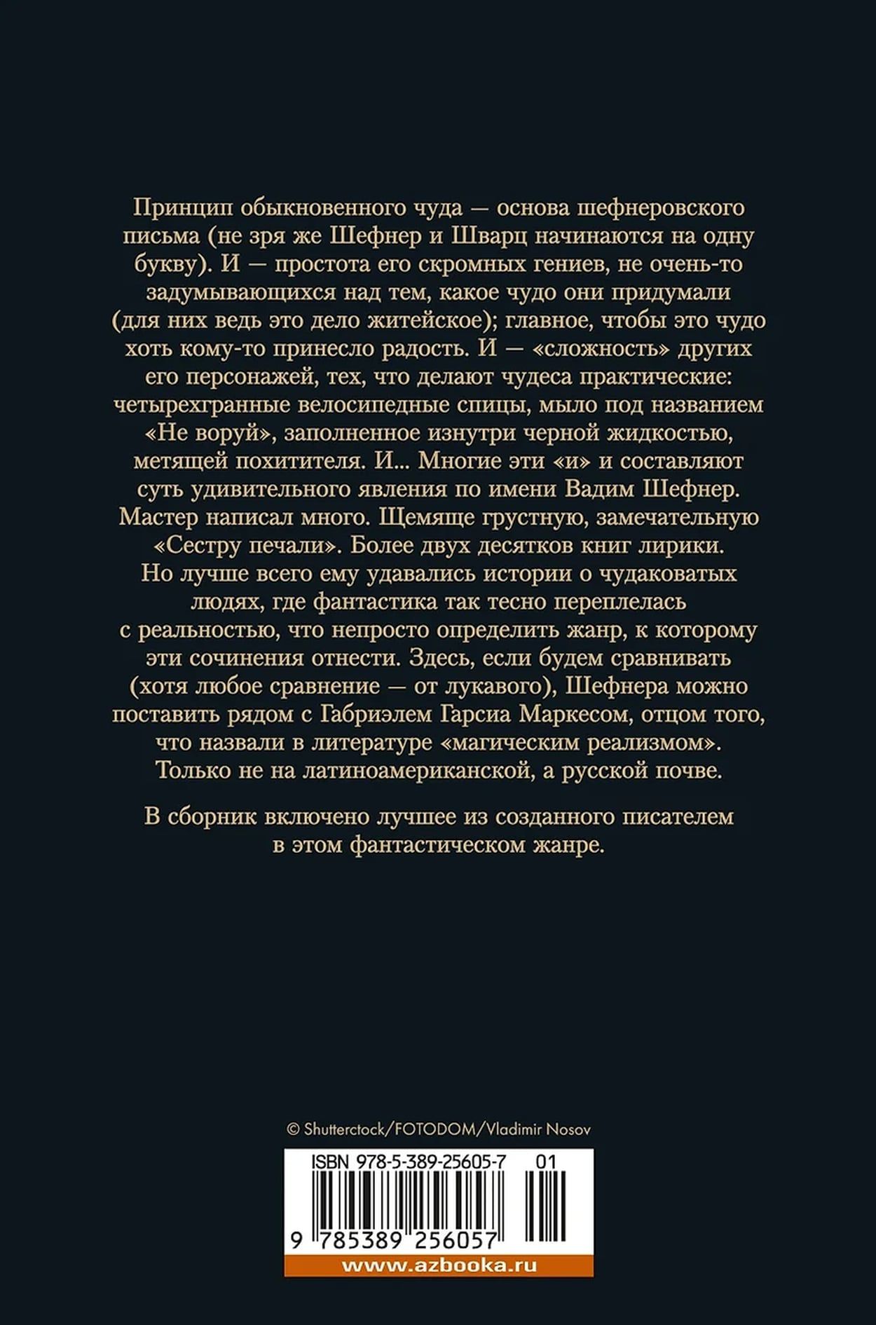 The principle of an ordinary miracle is the basis of Shefner's writing (it is not for nothing that Shefner and Schwartz begin with the same letter). And - the simplicity of his modest geniuses, who do not think much about what kind of miracle they have invented (for them, this is an everyday matter); the main thing is that this miracle brings joy to at least someone. And - the "complexity" of his other characters, those who perform practical miracles: tetrahedral bicycle spokes, soap called "Don't Steal", filled from the inside with a black liquid that marks the thief. And ... Many of these "ands" - and make up the essence of the amazing phenomenon called Vadim Shefner. The master wrote a lot. The poignantly sad, wonderful "Sister of Sorrow". More than two dozen books of lyric poetry. But he was best at stories about eccentric people, where fantasy is so closely intertwined with reality that it is difficult to determine the genre to which these works belong. Here, if we compare (although any comparison is from the evil one), Shefner can be placed next to Gabriel Garcia Marquez, the father of what was called in literature "magical realism". Only not on Latin American soil, but on Russian soil. The collection includes the best of what the writer has created in this genre.