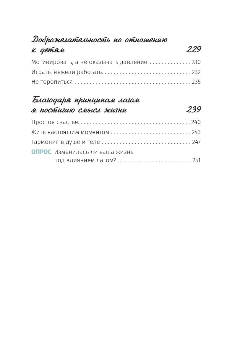 Getting rid of junk is a good thing. But not cluttering your space is even better. Lagom makes your life simple, convenient and aesthetically pleasing. Although this Swedish term is untranslatable, it carries with it a whole way of life. Lagom is about balance, the golden mean, a simple and orderly approach to everything. Lagom penetrates into the smallest details of life: the way we eat, organize our homes, raise our children, take care of ourselves. All of these little things, taken together, are essential to our overall well-being. To describe the lagom style briefly, it is "putting in order" - life space, work regime and even thoughts... Unload, ventilate and keep only the basics - this is what we can learn from the Swedes when organizing our lives. The book is similar in form to a blog. Each chapter is supplemented with comments and simple stories from readers that help you better understand the author's main ideas. You feel as if you are participating in a conversation with close friends.