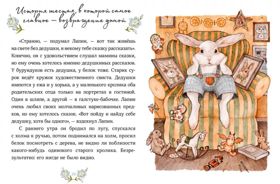 A cozy book about a little rabbit with wonderful illustrations, poems and recipes. Lapin is a little rabbit who can't sit still. He has to teach the hamster to listen to the wind whistling in his ears, feed the under-bed monster carrot lozenges and invent something urgently. Papa Lapin writes poetry, and mom knows where to find joy. And Lapin also has a magician uncle and a Traveling Simpleton (by the way, he found him himself). It's impossible not to love Lapin, because he's just like any child. In this book you will find not only 12 stories about Lapin with magical illustrations by Masha Sudovykh, but also beautiful poems, two recipes and instructions on how to make a lantern.